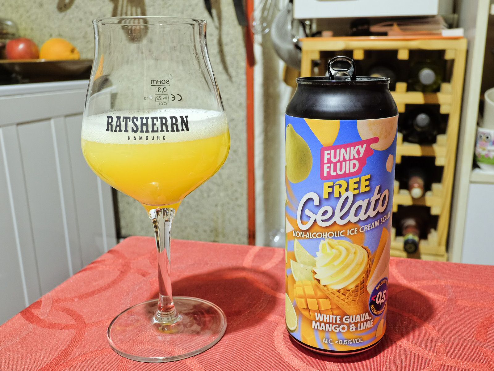Sweet & sour, heavily fruited non-alcoholic beer inspired by the intense flavor of Italian ice cream and famous dessert from Thailand: Mango Sticky Rice. (Zitat Browar Funky Fluid)