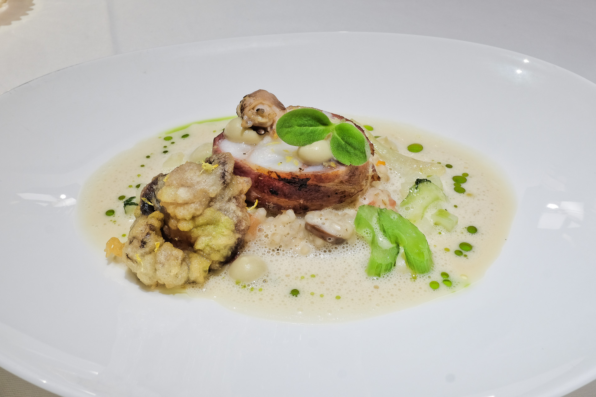 Der Seeteufel war zart und hatte ein feines Aroma, gegart wurde er in einem Speckmantel. Der Speck hatte zwar ein würziges Aroma aber eine etwas zähe Textur. Dazu gab es kleine Octopusse (Polipetti) oder "Octopussys", einmal Natur und einmal als Tempura, griechisches Gemüse (Artischocken, Fenchel, Staudensellerie), ein Perlgraupen Risotto mit Oliven und eine Champagner Beurre blanc. Sehr lecker.
