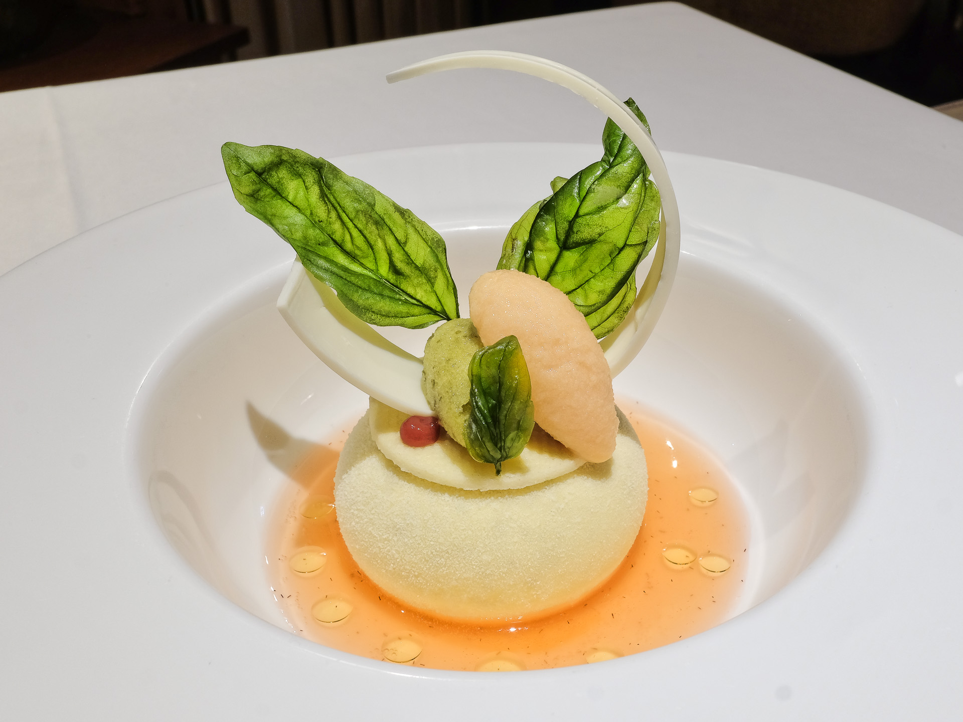 Als Dessert gab es ein mit einem Walderdbeeren Püree gefüllte weiße Schokoladen Mousse, ein Basilikum Eis, ein Tomaten Eis, frittierte Basilikumblätter, weiße Ivoire Schokolade von Valrhona und einen Tomaten Sud. Die frittierten Basilikumblätter waren sehr zart und crisp, durch das Frittieren hatten sie aber das meiste Aroma verloren. Sehr lecker.