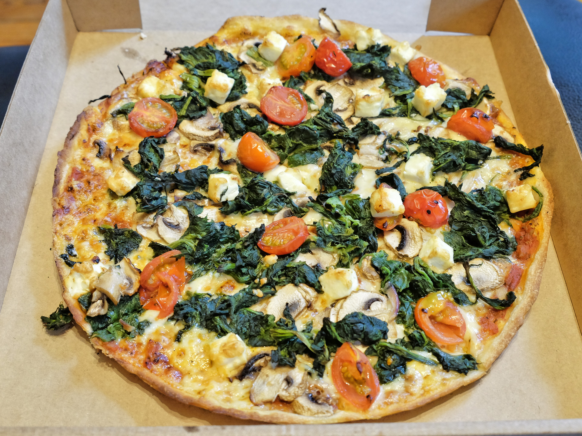 Die Pizza hatte einen dünnen Teig der am Rand etwas kross war. Belegt war die Pizza mit Tomatensauce, Käse, Kirschtomaten, Champignons, Spinat und Hirtenkäse. Sehr lecker.