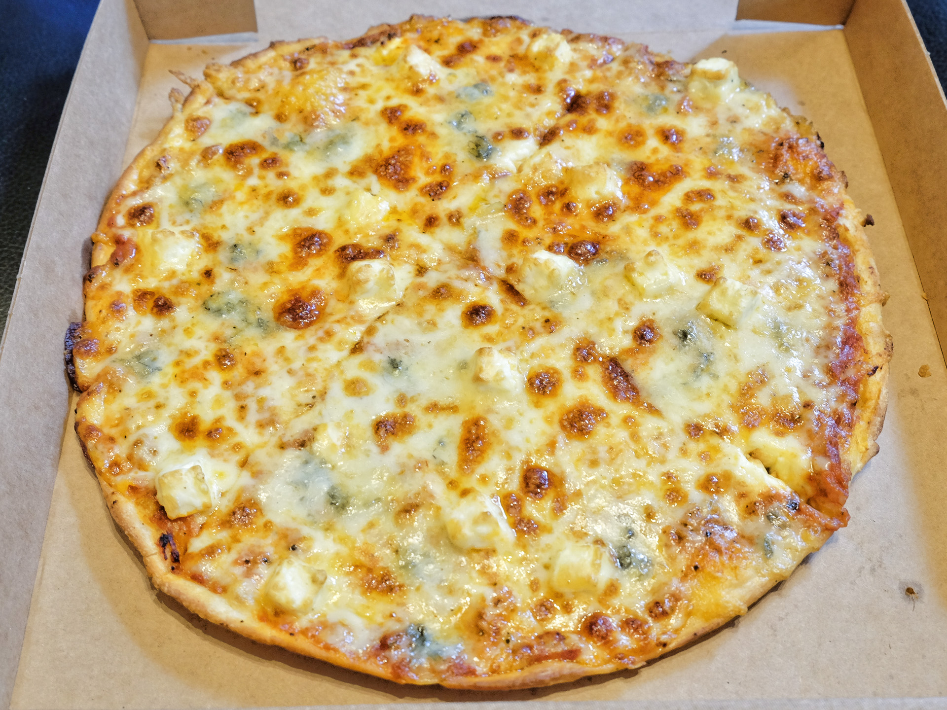 Die Pizza hatte einen dünnen Teig der am Rand etwas kross war. Belegt war die Pizza mit Tomatensauce und vier verschiedenen Käsesorten, Gouda, Mozzarella, Gorgonzola und Feta. Sie war schön aromatisch und saftig, sehr lecker.