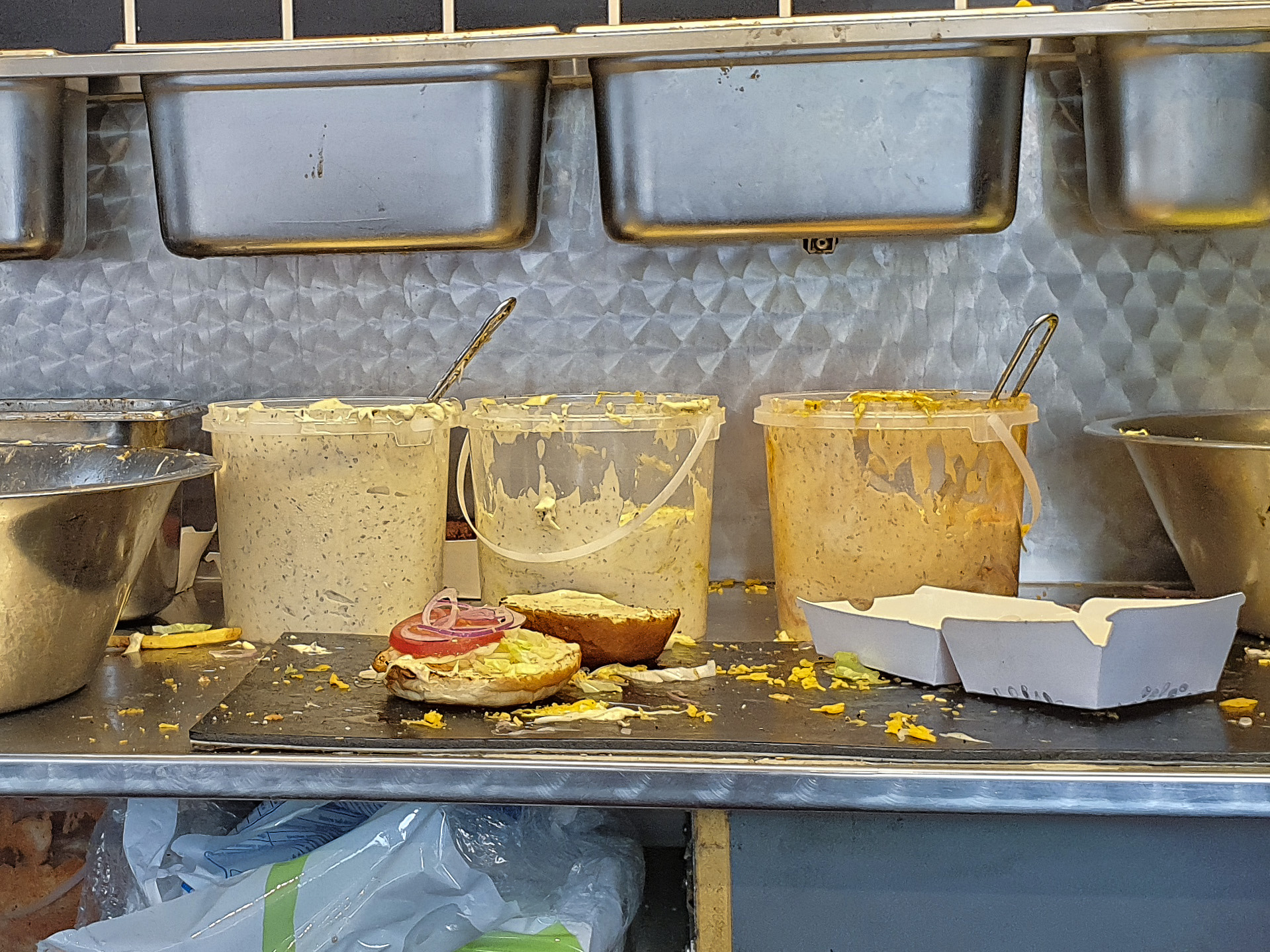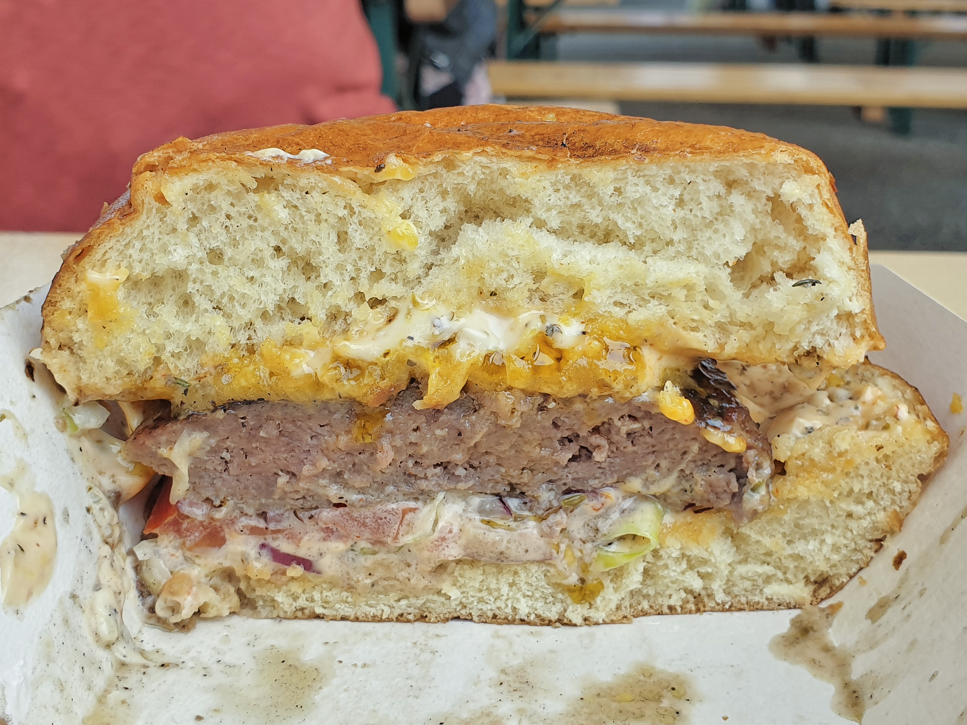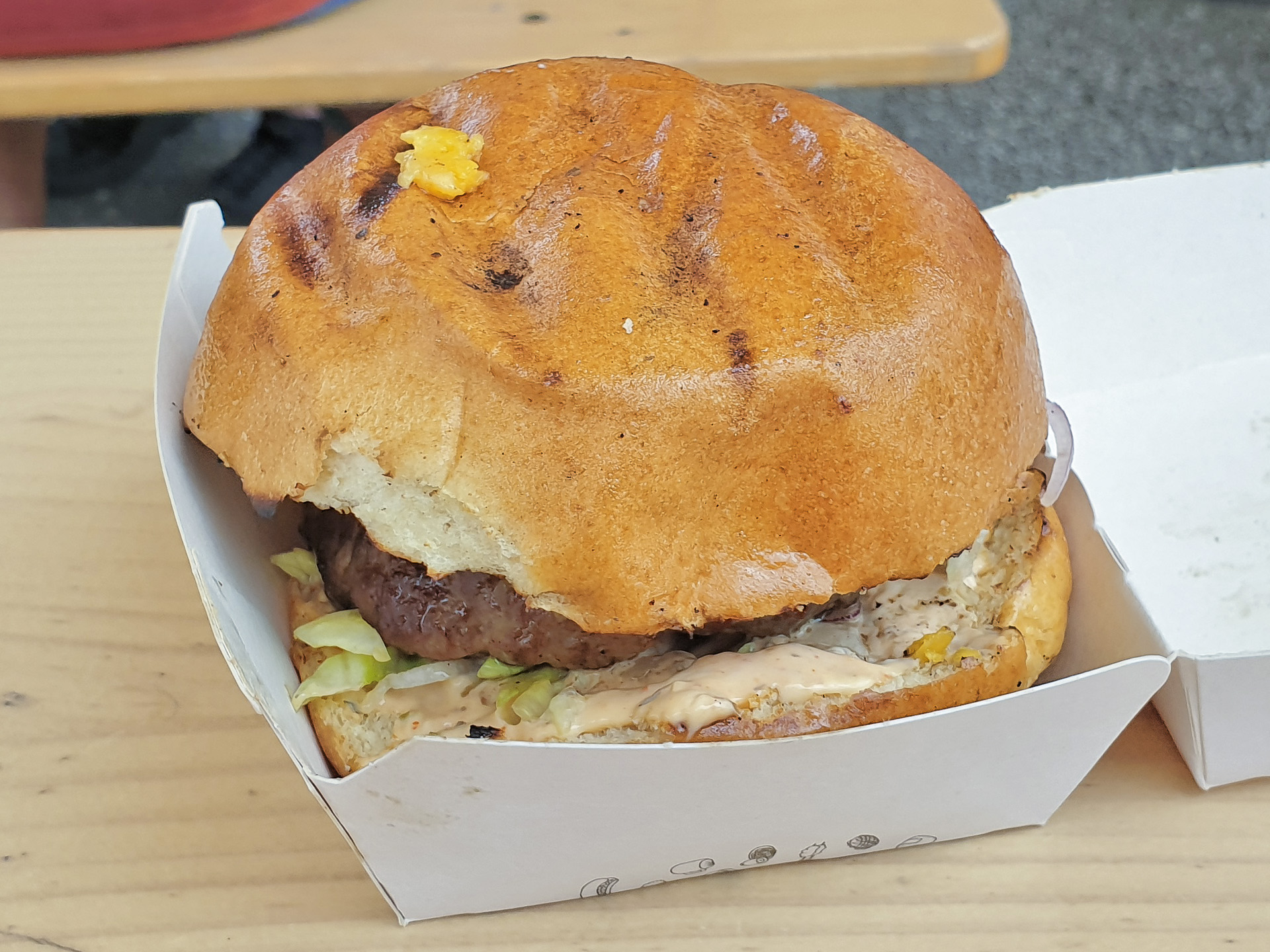 Das Bun war schön locker und nicht pappig. Das Patty war leider etwas fest und sehnig. Der Burger war noch mit Zwiebeln, Tomaten, Käse (?), Salat und einer Sauce belegt. Gerade noch sehr lecker.