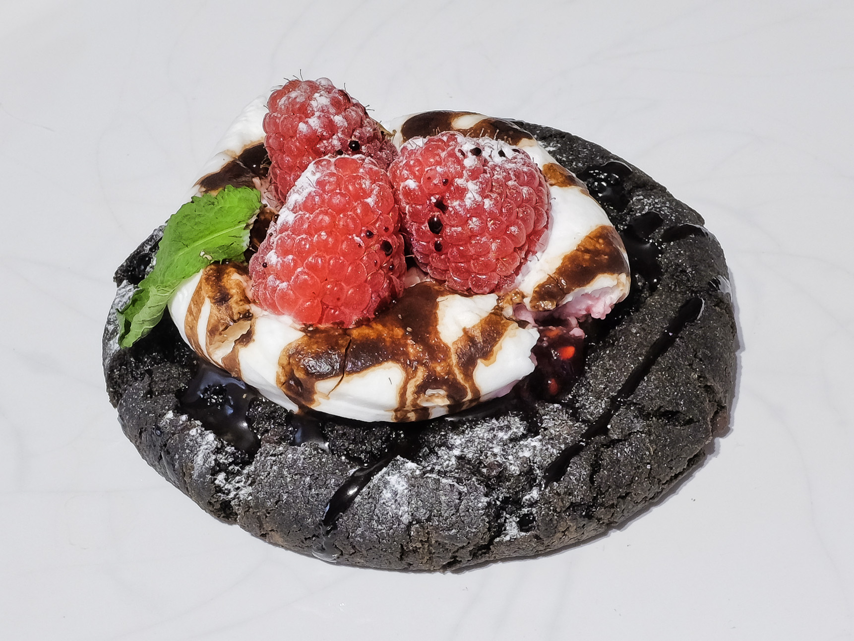 Der Cookies hatte eine leicht zähe pappige Textur und ein leicht schokoladiges Aroma. Dazu gab es eine eher neutrale feste Creme und aromatische Himbeeren. Gerade noch sehr lecker.