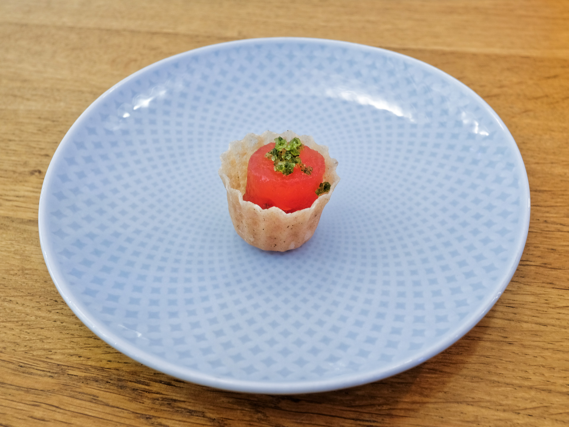 Als Amuse Gueule gab es ein kleines Tartelette mit Wassermelone und etwas Minz Salz. Es war crisp, saftig und hatte ein feines Aroma. Sehr lecker aber nicht spektakulär.