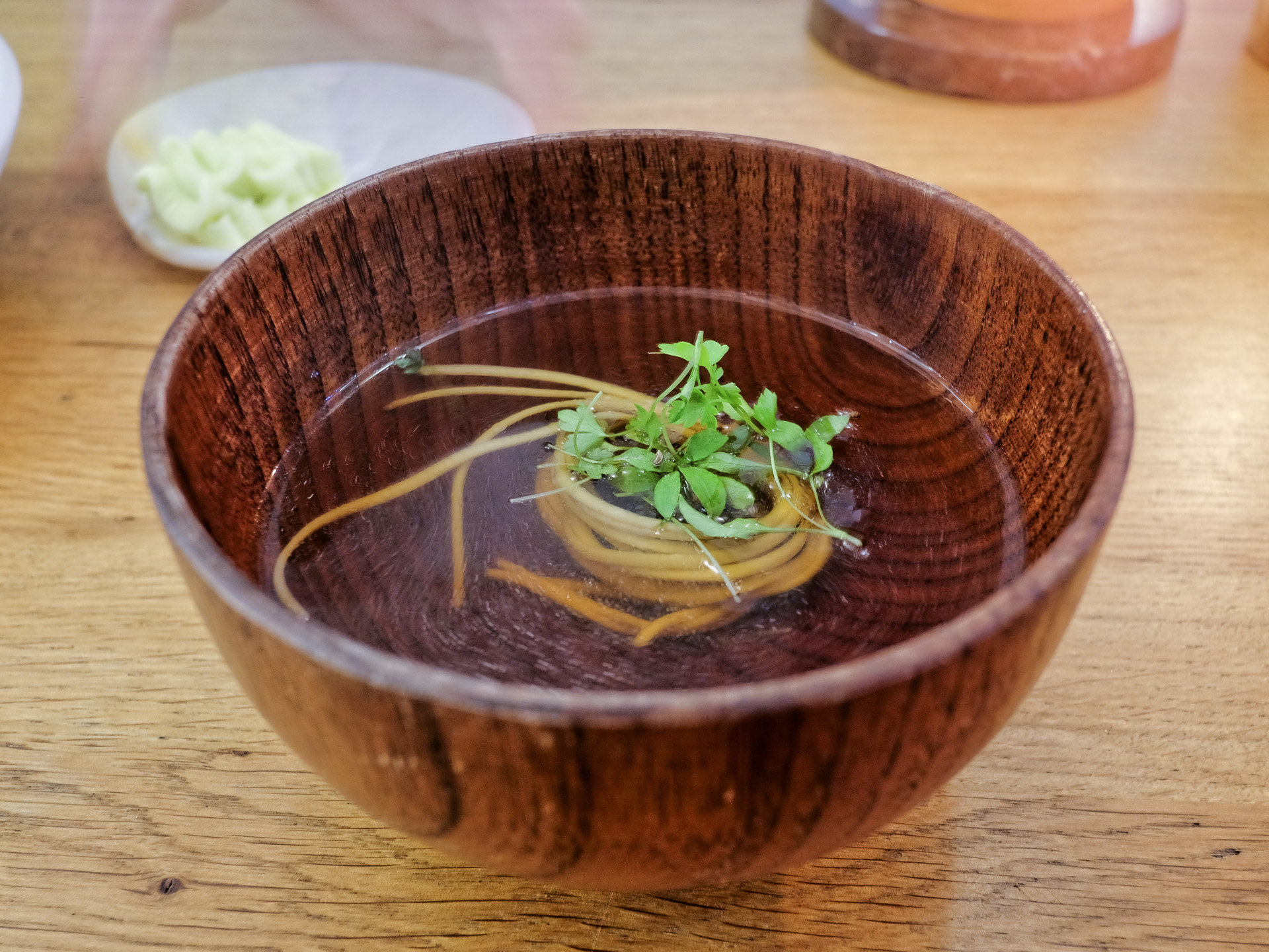 Rosöl ist ein Gericht der polnische Küche, ursprünglich eine Hühnersuppe wurde sie hier aber als vegetarische Variante gereicht. Sie hatte ein feines, leicht süßliches Aroma, zubereitet wurde sie mit Liebstöckel und Käserinde. Dazu gab es perfekt al dente Nudeln. Sehr lecker.