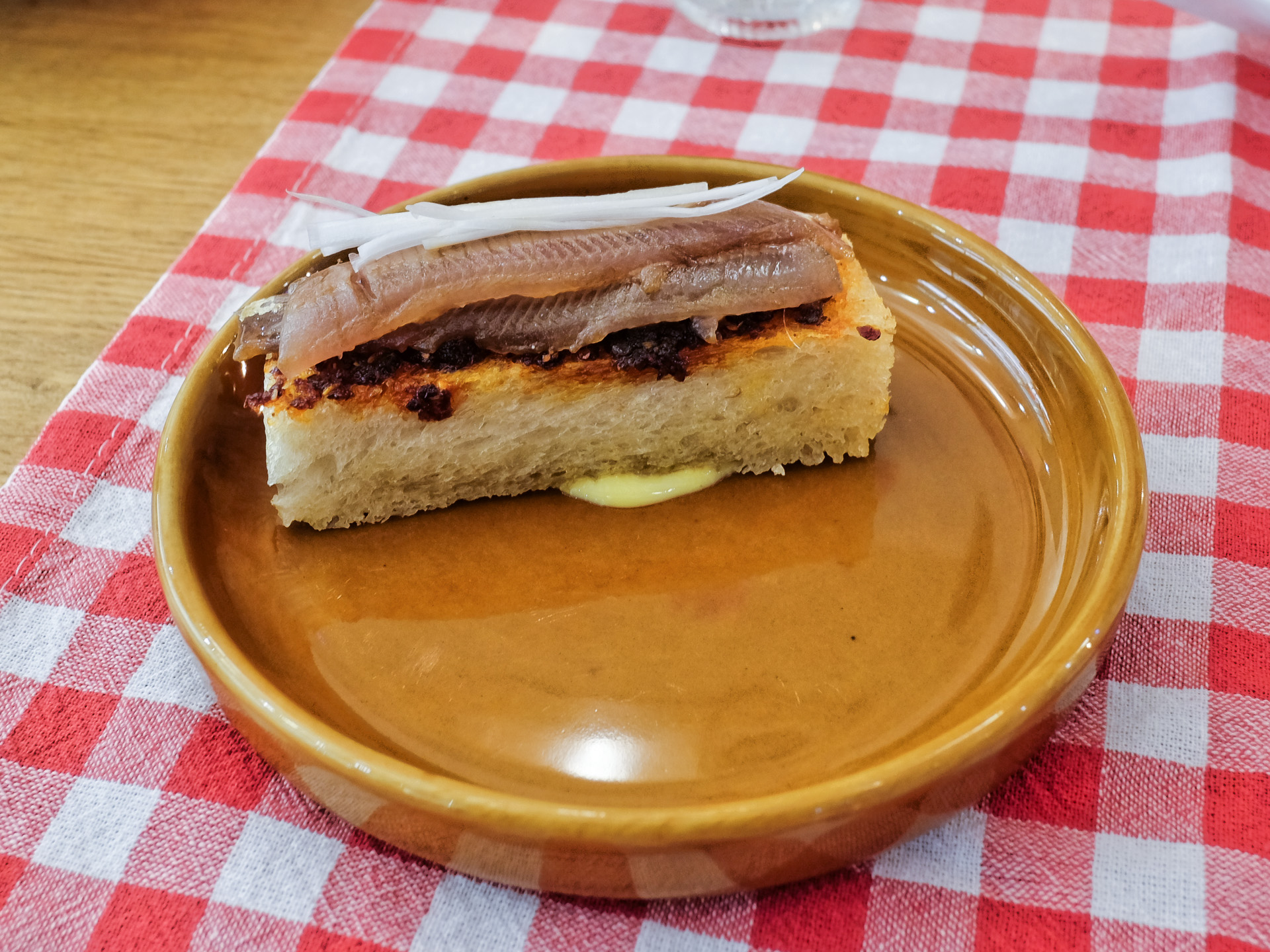 Solomon Gundy ist ein Gericht der polnische Küche. Auf einem leicht krossen Brot war eine rohe Sardine mit etwas Ingwer angerichtet. Der Fisch war zart und hatte ein feines Aroma mit feiner Schärfe. Sehr lecker, Klasse.
