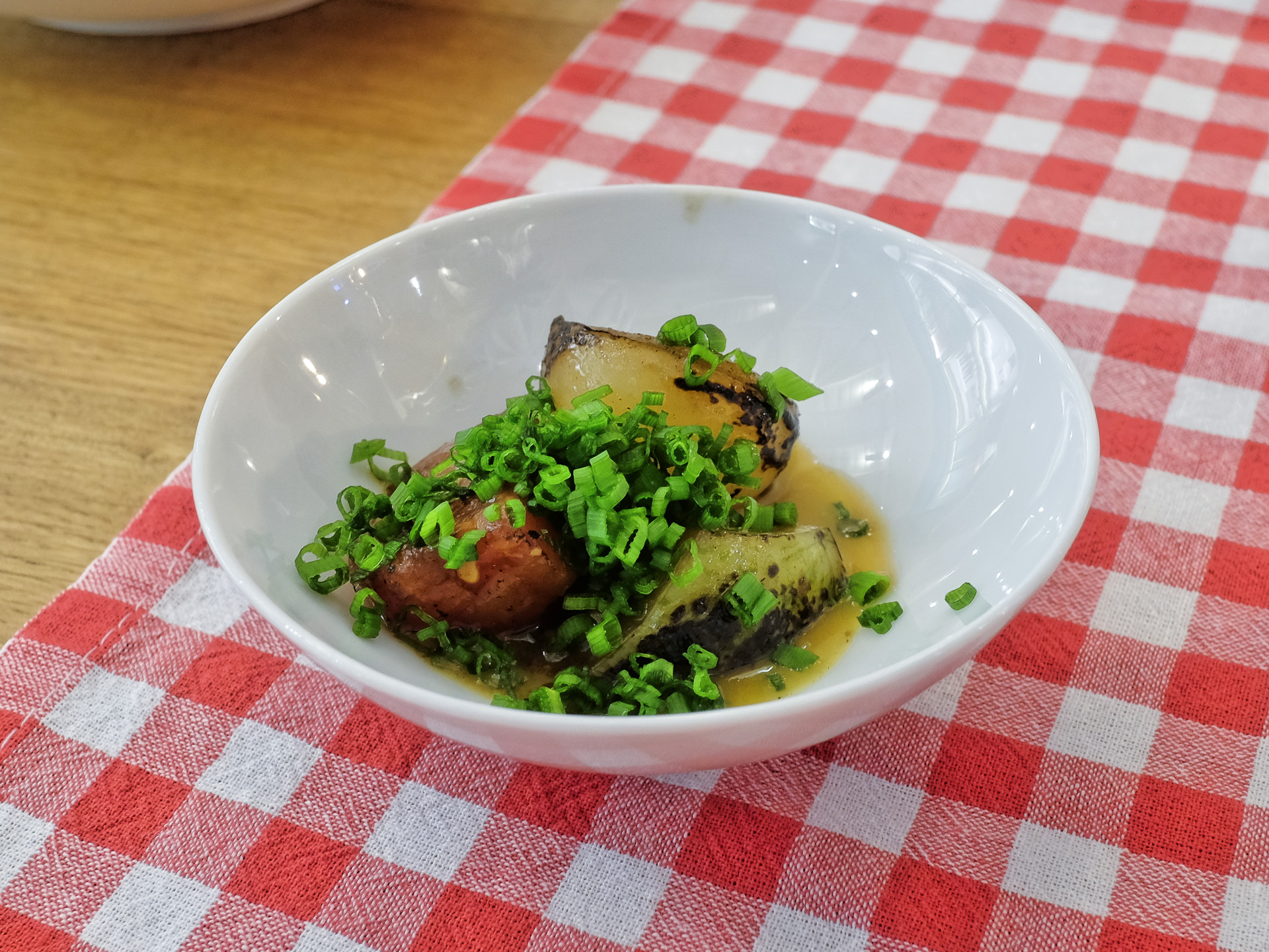 Das Gericht bestand aus roten und grünen Tomaten, die wohl z.T. gegrillt oder geräuchert waren. Dazu gab es etwas Ananassaft, Rapsöl und Sojasauce. Sehr lecker.
