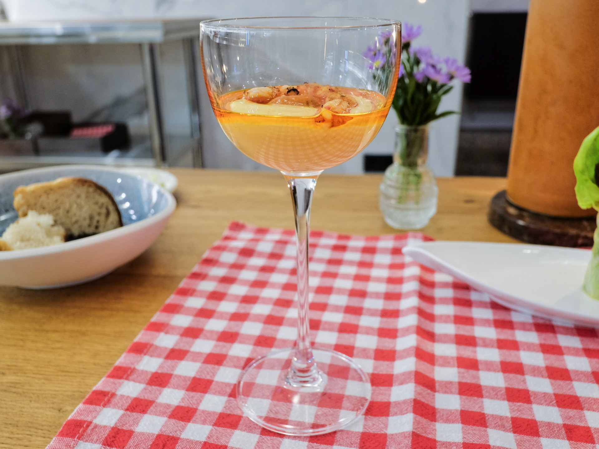Pepper Shrimp ist ein Gericht der jamaikanischen Küche. Auf einer Joghurtcreme mit etwas Krustentier Öl war eine rohe Garnele angerichtet. Die Garnelen war zart und hatte ein feines Aroma, die Creme hatte eine pikante Schärfe. Sehr lecker.