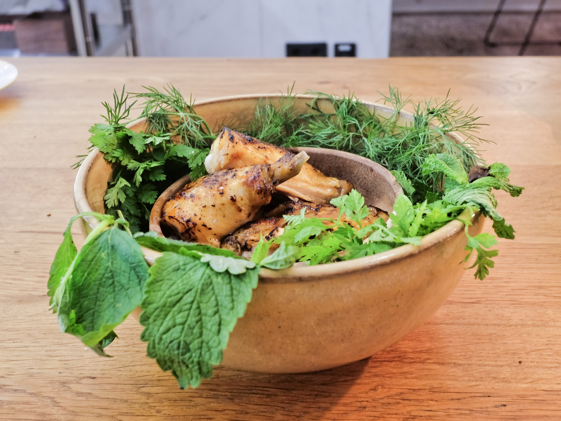 Jerk ist eine Gewürzmischung der jamaikanischen Küche. Die Chicken Wings vom Stubenküken waren sehr zart und hatten ein feines Aroma, die Schale war mit etwas Rauch gefüllt. Dazu gab es kleine Kartoffelklöße (in Anlehnung an die polnische Küche) und eine schöne tiefgründige Sauce mit leichter Schärfe (Klasse). Ein schönes Gericht, sehr lecker.