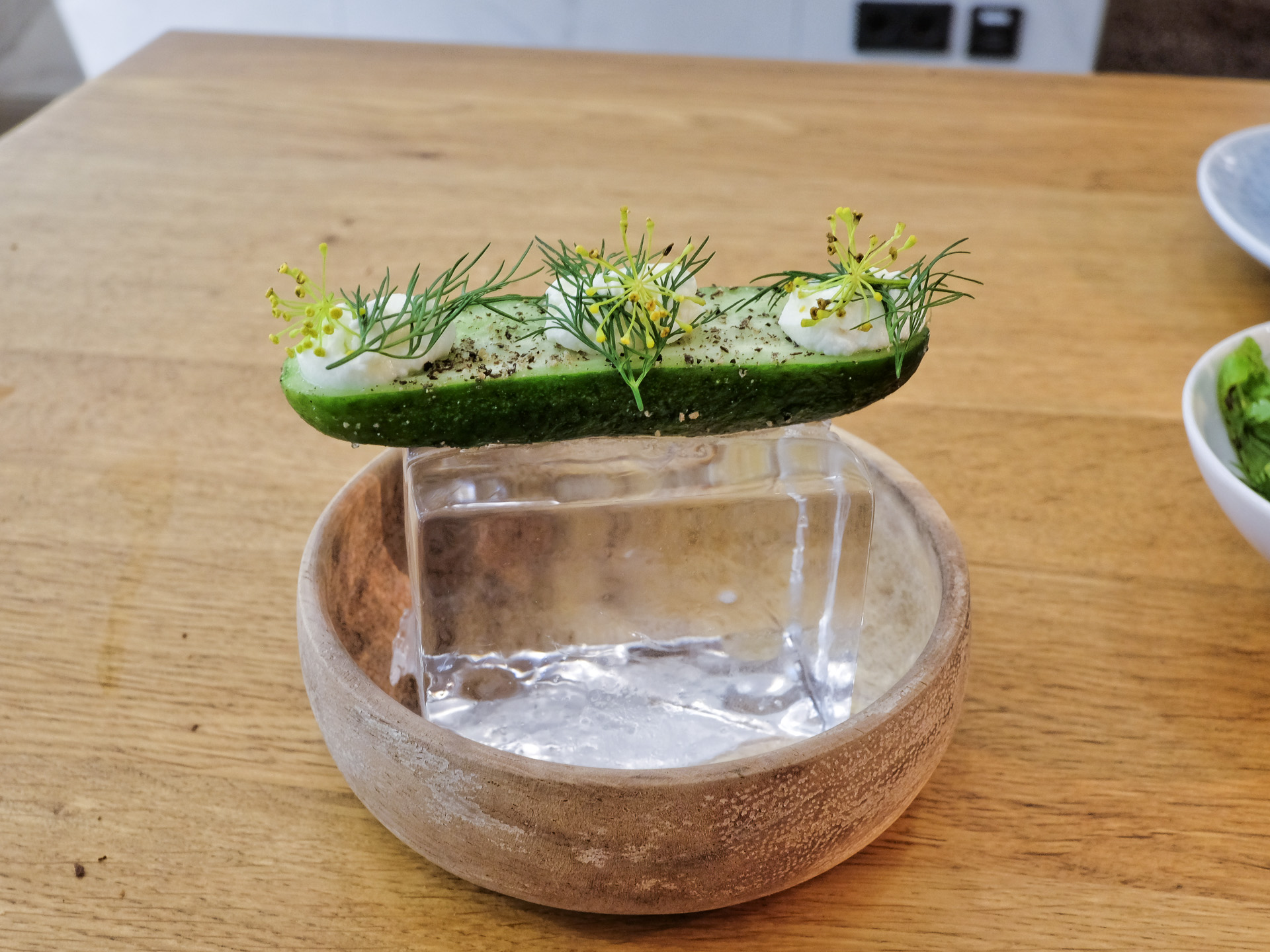 Mizeria ist ein Gericht der polnische Küche, die Gurke wurde auf einen Eisblock serviert. Die Gurke war sehr zart und sehr knackig und hatte ein feines Aroma. Sehr lecker, Klasse.