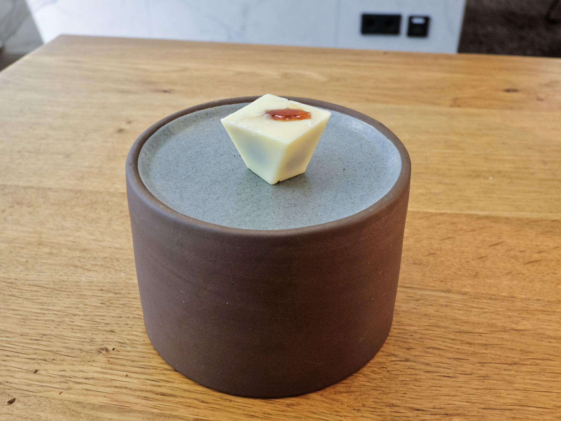 Die weiße Schokolade war mit Rum Rosinen gefüllt. Sehr lecker.