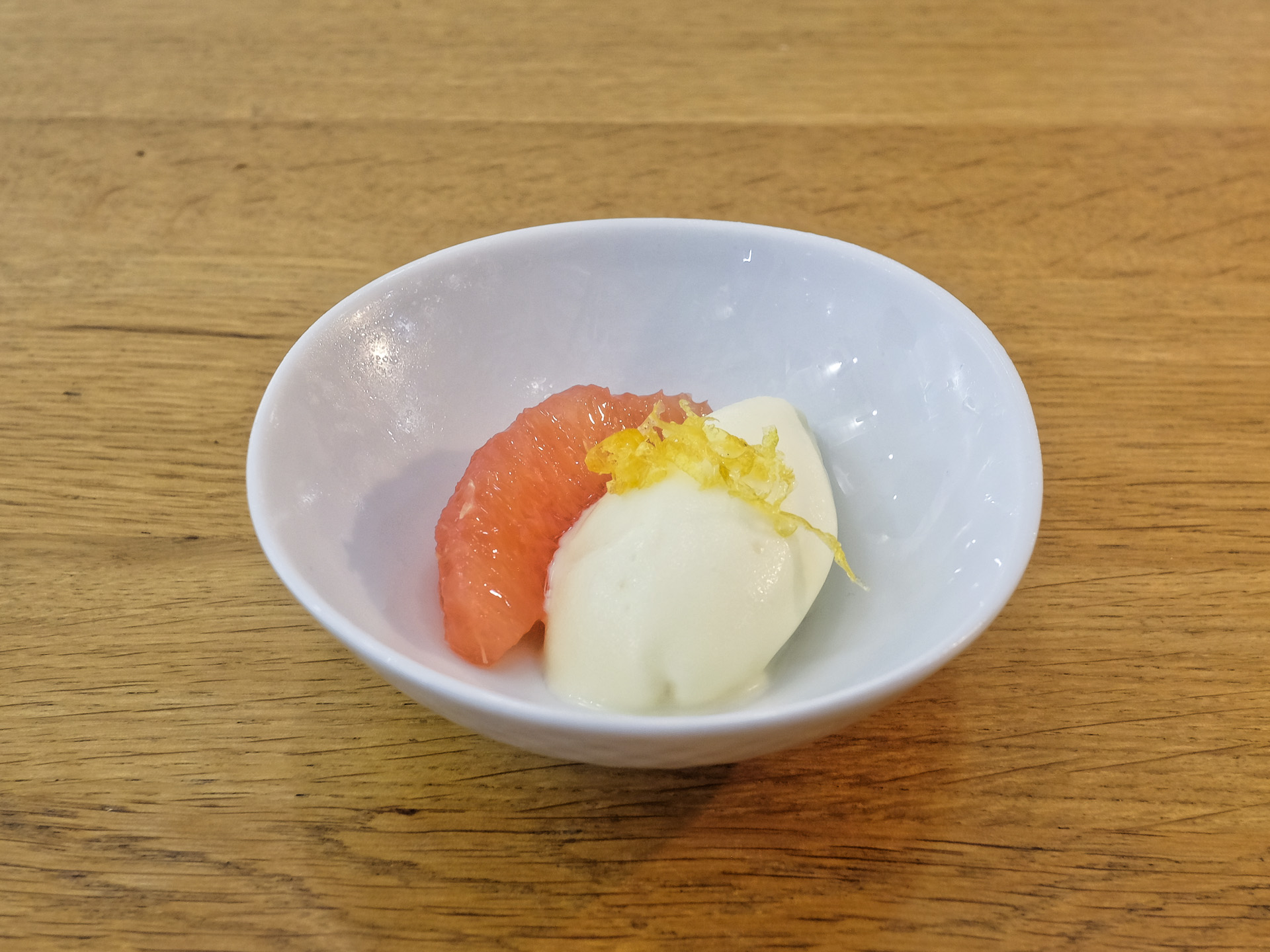 Zum Abschluß gab es ein schön cremiges Kondensmilch Eis mit feiner Süße und etwas Grapefruit mit feiner Bitternote. Sehr lecker.