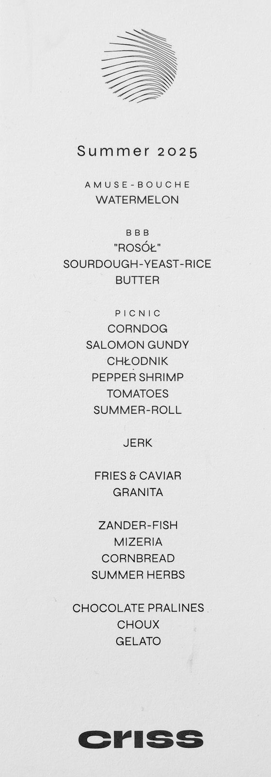 Im Criss Studio gibt es keine Speisekarte mit der Speisenfolge, die einzelnen Gänge werden ohne Erklärung serviert. Hinterher kommt Herr Zurek oder Herr Grant an den Tisch und erklärt das Gericht und den Hintergrund. Die Kommunikation im Criss Studio erfolgt in Englisch.