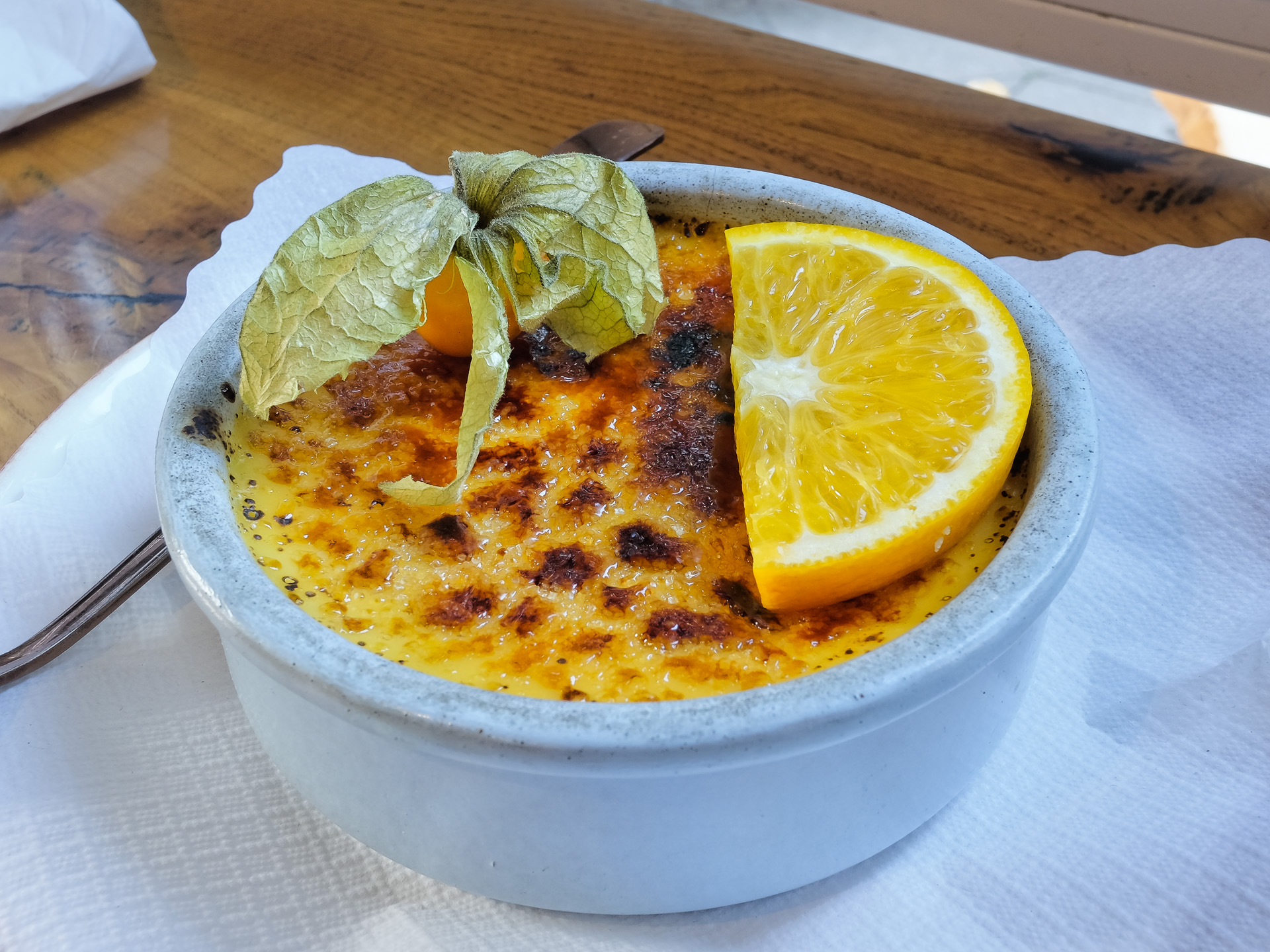 Die Crema catalana war sehr weich, die Zuckerkruste war leicht bitter, zwischen Creme und Zuckerkruste gab es eine Haut. Dazu gab es noch eine Physalis und eine Orangenscheibe. Gerade noch sehr lecker.