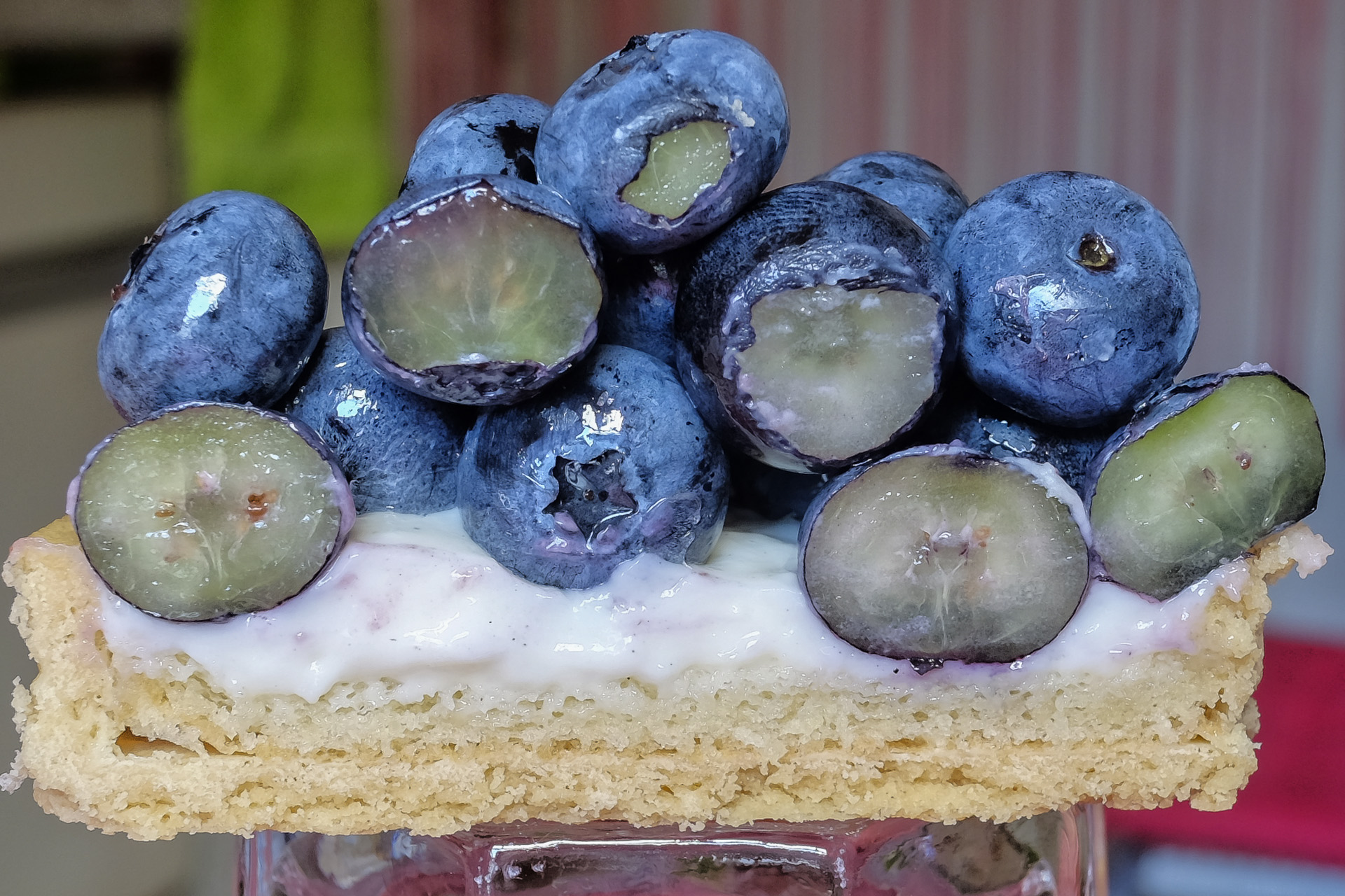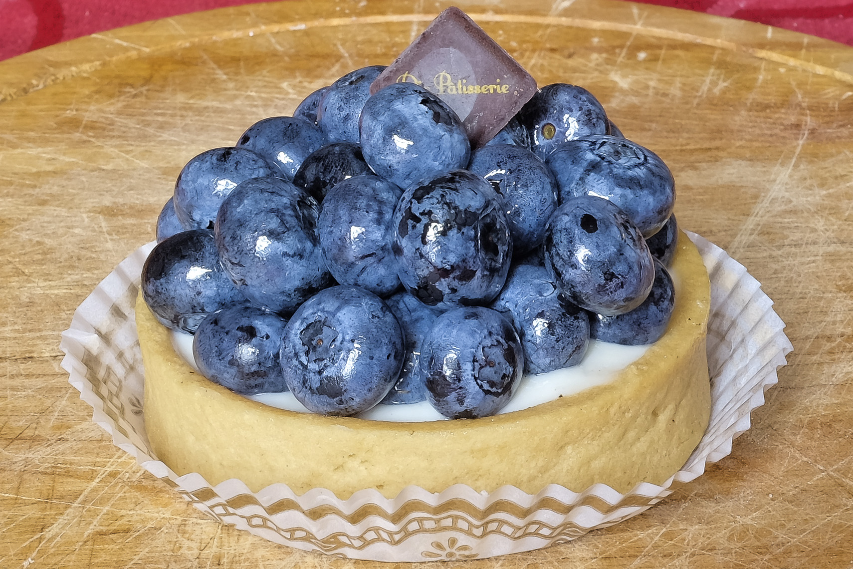 Mandelmürbeteig, Mandelcrème, Heidelbeerkonfitüre, on top frische Heidelbeerfrüchte. (Zitat Die Patisserie)