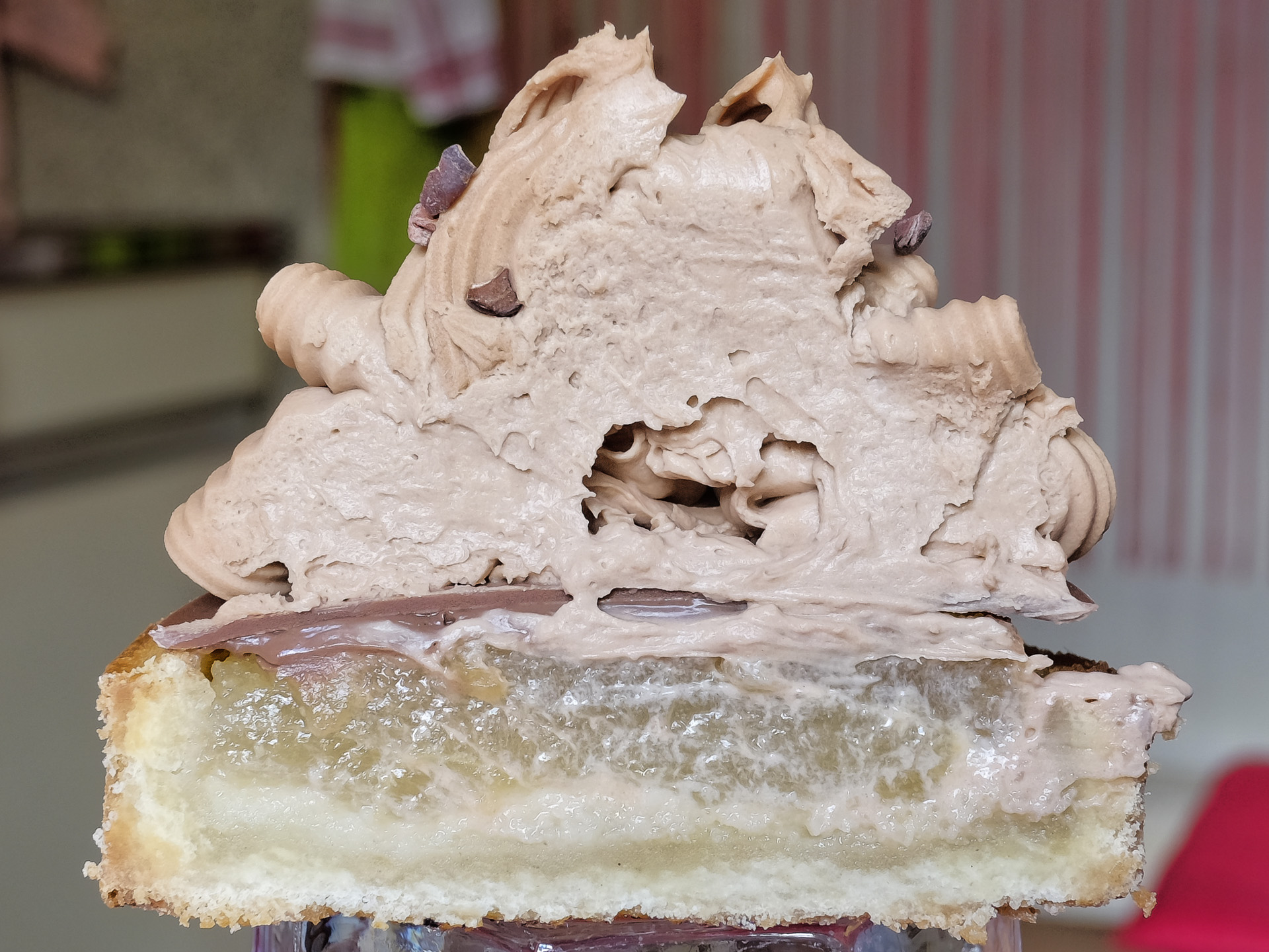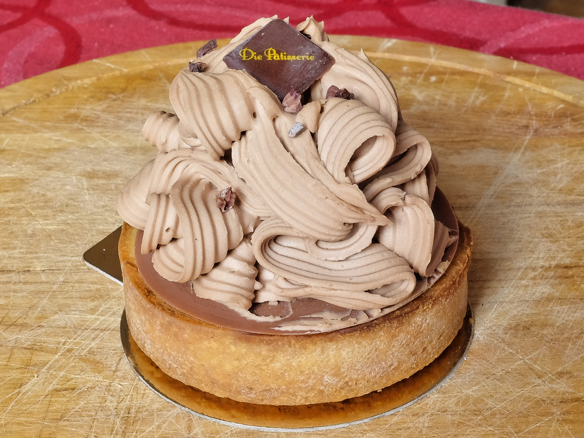 Mandelmürbeteig, Mandelcrème, feine Birne und Mousse au chocolat. (Zitat Die Patisserie)