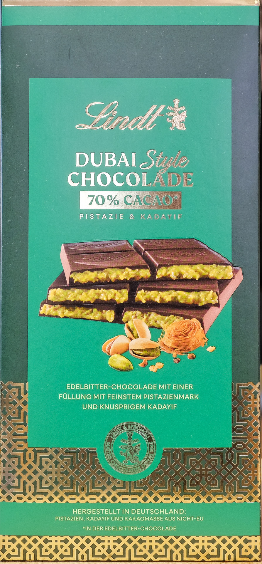 Die Reise geht weiter: Lindt Dubai Style Chocolade Dunkel! Die aromatische und intensive Note der 70% Edelbitter-Schokolade harmoniert ideal mit der süßen Füllung aus Kadayif und Pistazie. Eine elegante, vielschichtige Kombination. (Zitat Lindt & Sprüngli)