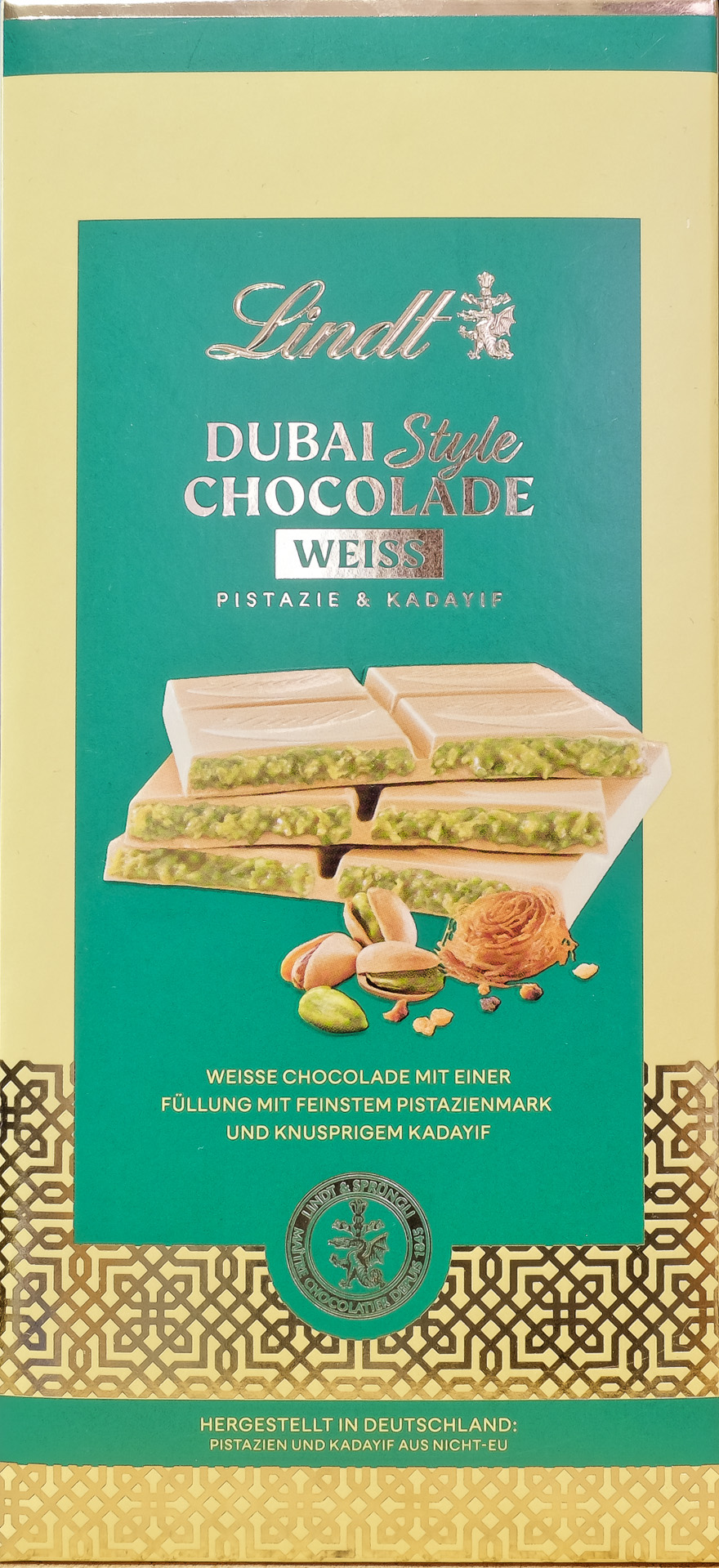 Die Reise geht weiter: Lindt Dubai Style Chocolade Weiß! Die weiße Schokolade bildet eine besonders cremige Basis mit feiner Süße für die Dubai Style Chocolade, die mit ihrem einzigartigen Schmelz besonders die nussigen Noten der Pistazie hervorbringt. (Zitat Lindt & Sprüngli)