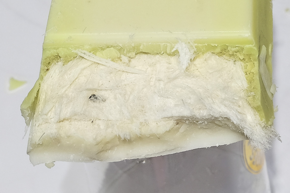 Die Schokolade hatte einen zarten Schmelz und ein feines Aroma. Gefüllt war sie mit schön lockerer Zuckerwatte (Pismaniye) und einer Pistaziencreme. Die Zuckerwatte hatte eine interessante langfaserige, nicht klebrige Textur, sie zerfiel auf der Zunge. Die Pistaziencreme hatte ein feines Aroma. Sehr lecker, Klasse. Gekauft bei Rewe.