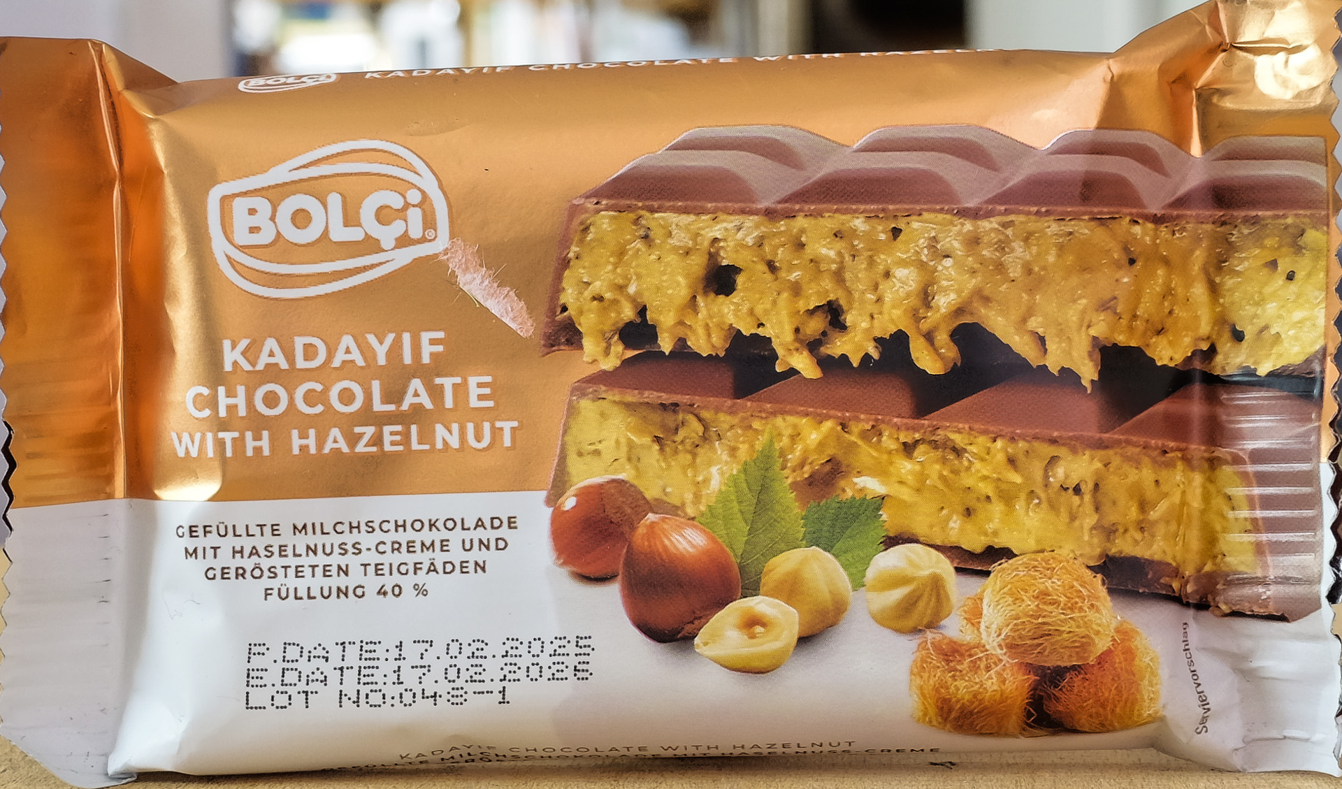 Die Milchschokolade hatte einen zarten Schmelz, die Haselnuss Füllung war leicht cremig und leicht salzig. Die Kadayffäden sorgten für einen Knuspereffekt. Etwas zu süß, gerade noch sehr lecker.