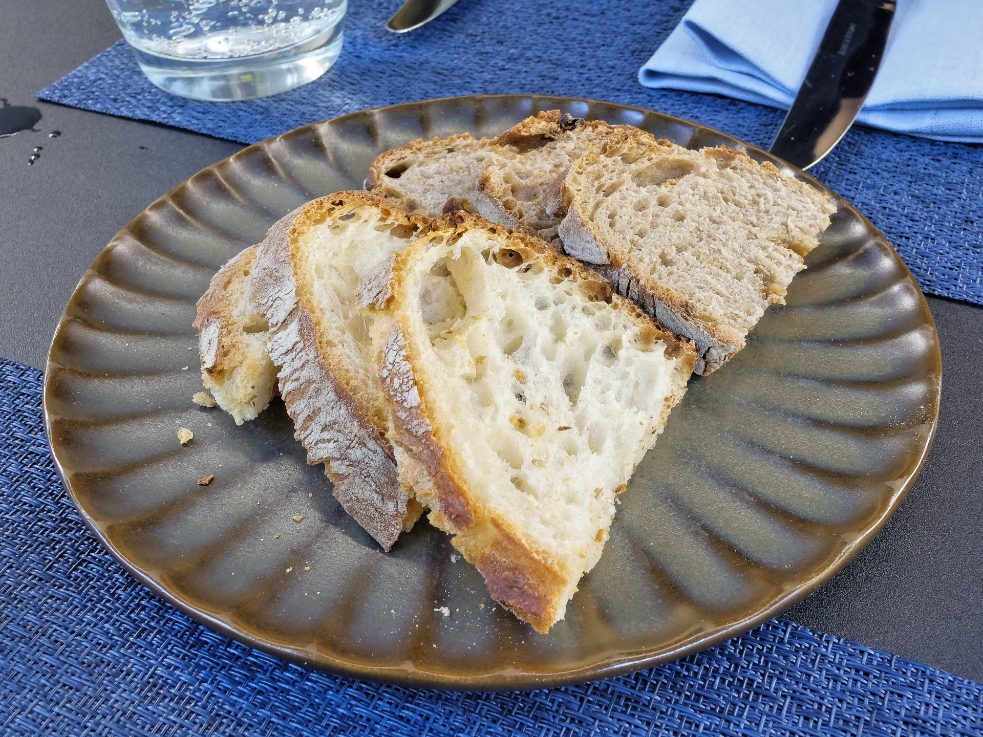 Vor dem Essen wurde etwas Brot gereicht, es hatte eine rösche Kruste, eine feine Krume und ein feines Aroma. Sehr lecker, Klasse.