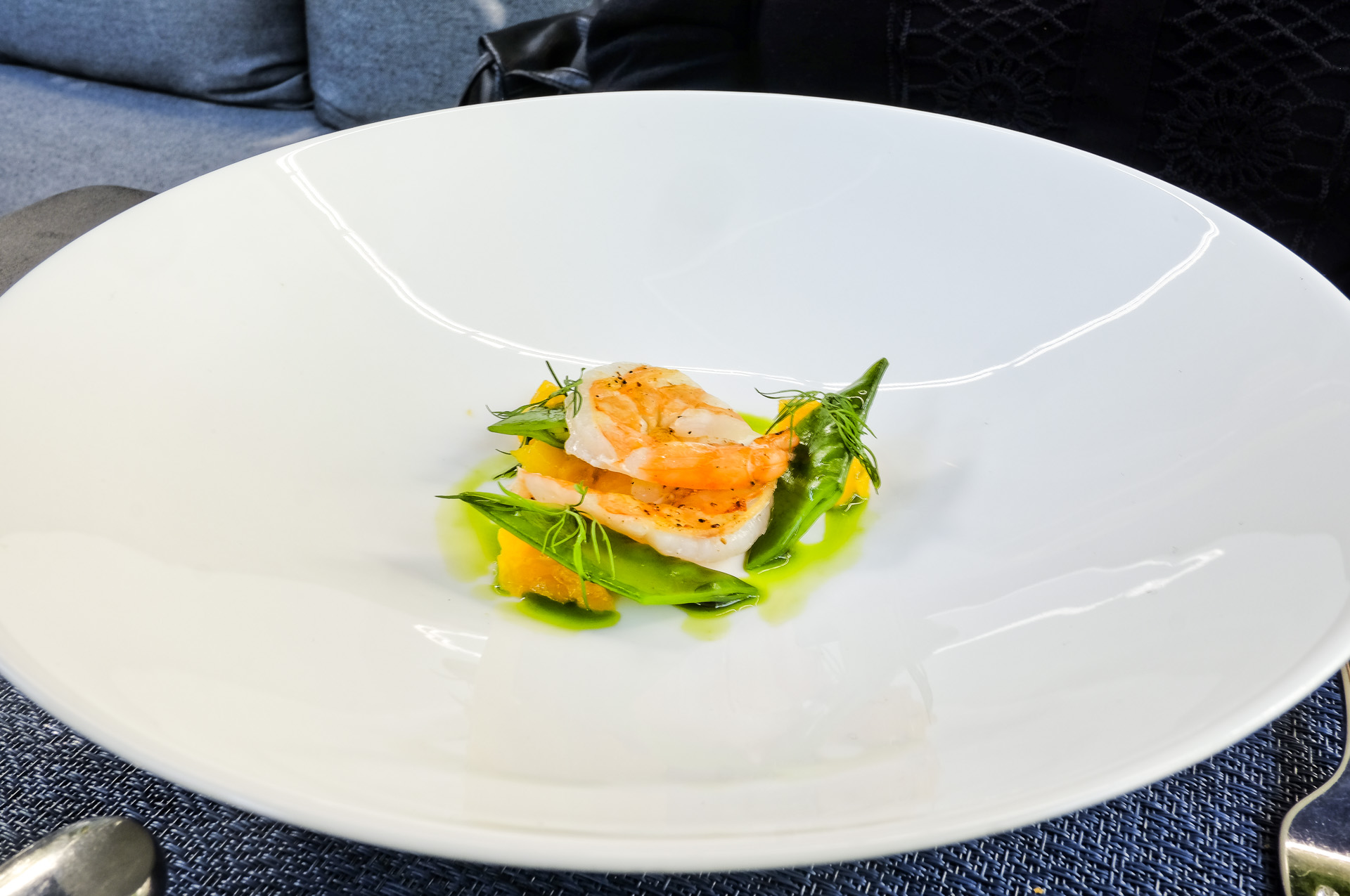 Die Veloute von Zitronengras, Curry und Piment d'Espelette war schön cremig und hatte ein feines Aroma mit feiner Schärfe. Dazu gab es eine gebratene Rotgarnele, ein paar Zuckerschoten und etwas Mango. Die Rotgarnele war fast roh, etwas weiter gegart wäre sie besser zur Geltung gekommen. Sehr lecker.