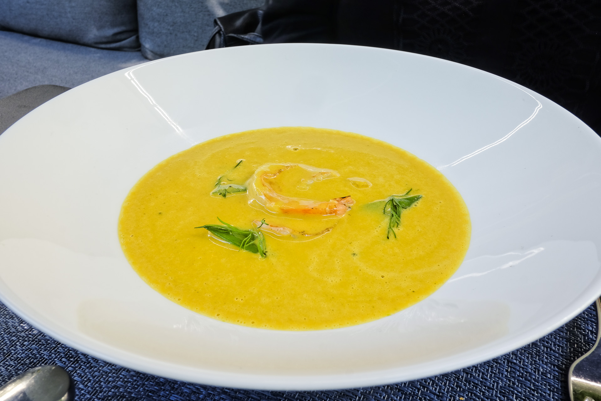 Schaumige Curry Zitronengras-Suppe mit gebratener Rotgarnele, Piment d’espelette