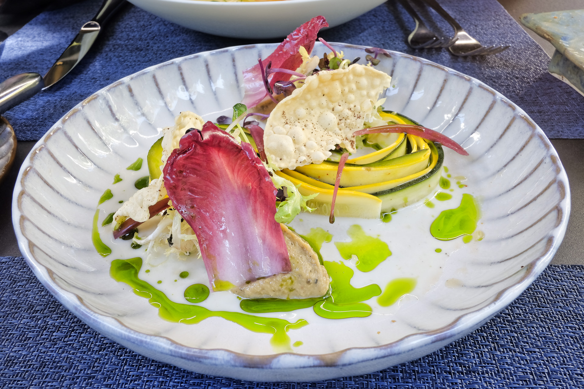 Die grünen und gelben Zucchini waren in dünne Scheiben geschnitten. Dazu gab es Baba Ghanoush, Papadam und eine aromatische Kefir Granatapfel Vinaigrette mit leichter Säure und einem Hauch Schärfe. Sehr lecker.