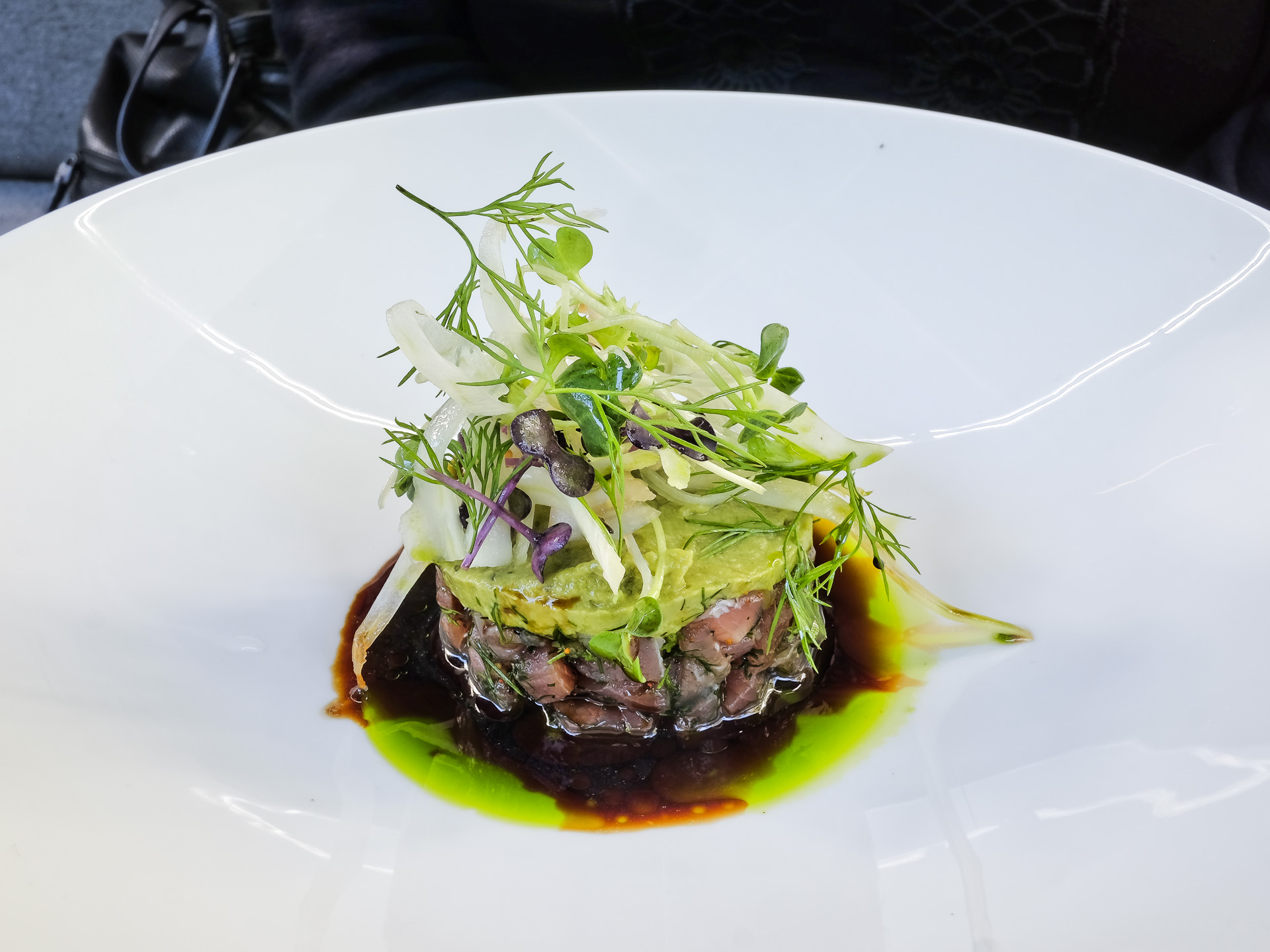 Das Tatar vom Balfego Thunfisch war zart und hatte ein feines Aroma. Dazu gab es eine Avocadocreme, etwas Salat (u.a. mit Fenchel, Kresse und Dill) und eine kräftige Vinaigrette mit Sojasauce. Sehr lecker.