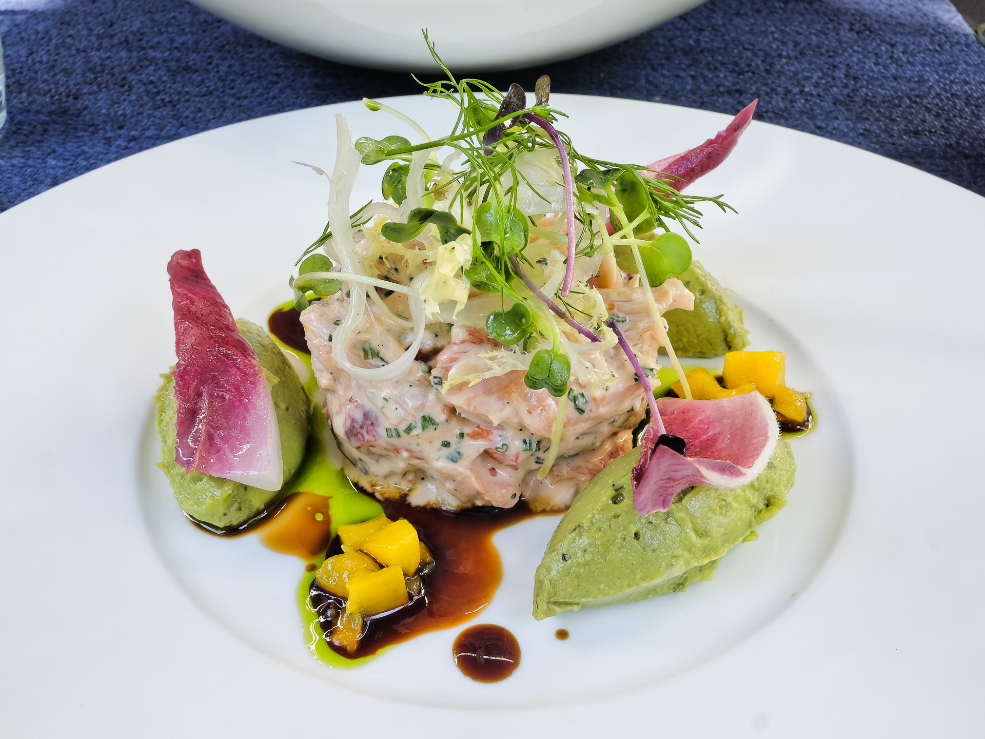 Der bretonische Hummer war zart und hatte ei n feines Aroma, angemacht war er mit einer aromatischen Cocktailsauce. Dazu gab es Nocken von Guacamole und etwas Mango. Sehr lecker.