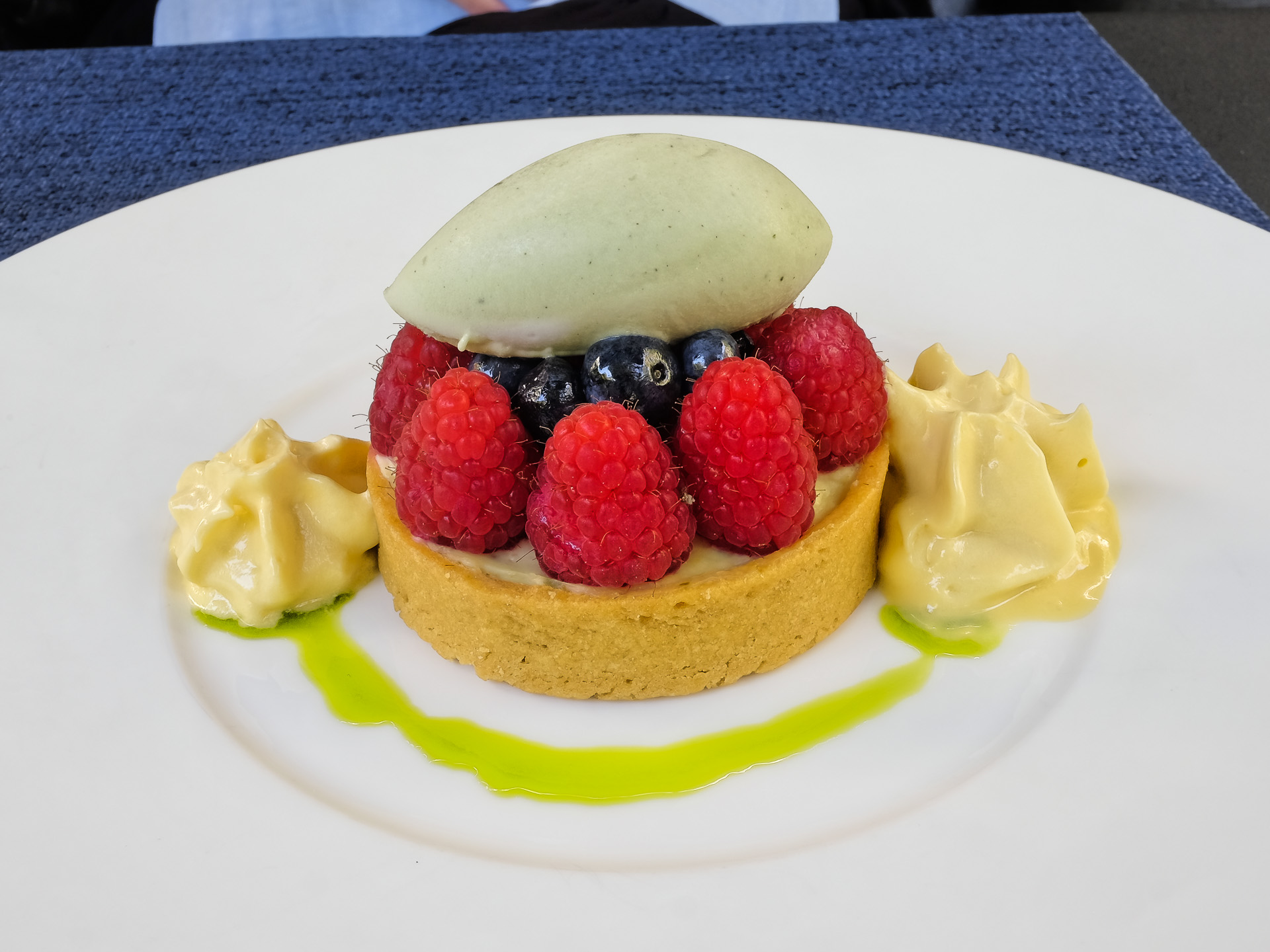 Als Dessert des Tages gab es eine Beeren Tarte mit einem Thai-Basilikum Zitronen Sorbet und etwas Zabaglione. Das Mürbeteig Tartelette war mit einer Pistazie Creme und aromatischen Himbeeren und Blaubeeren gefüllt. Das Sorbet hatte ein feines Aroma, eine schöne Kombination. Die Zabaglione war sehr zart und schaumig und hatte eine feine Alkoholnote. Ein schönes Dessert, sehr lecker, Klasse.