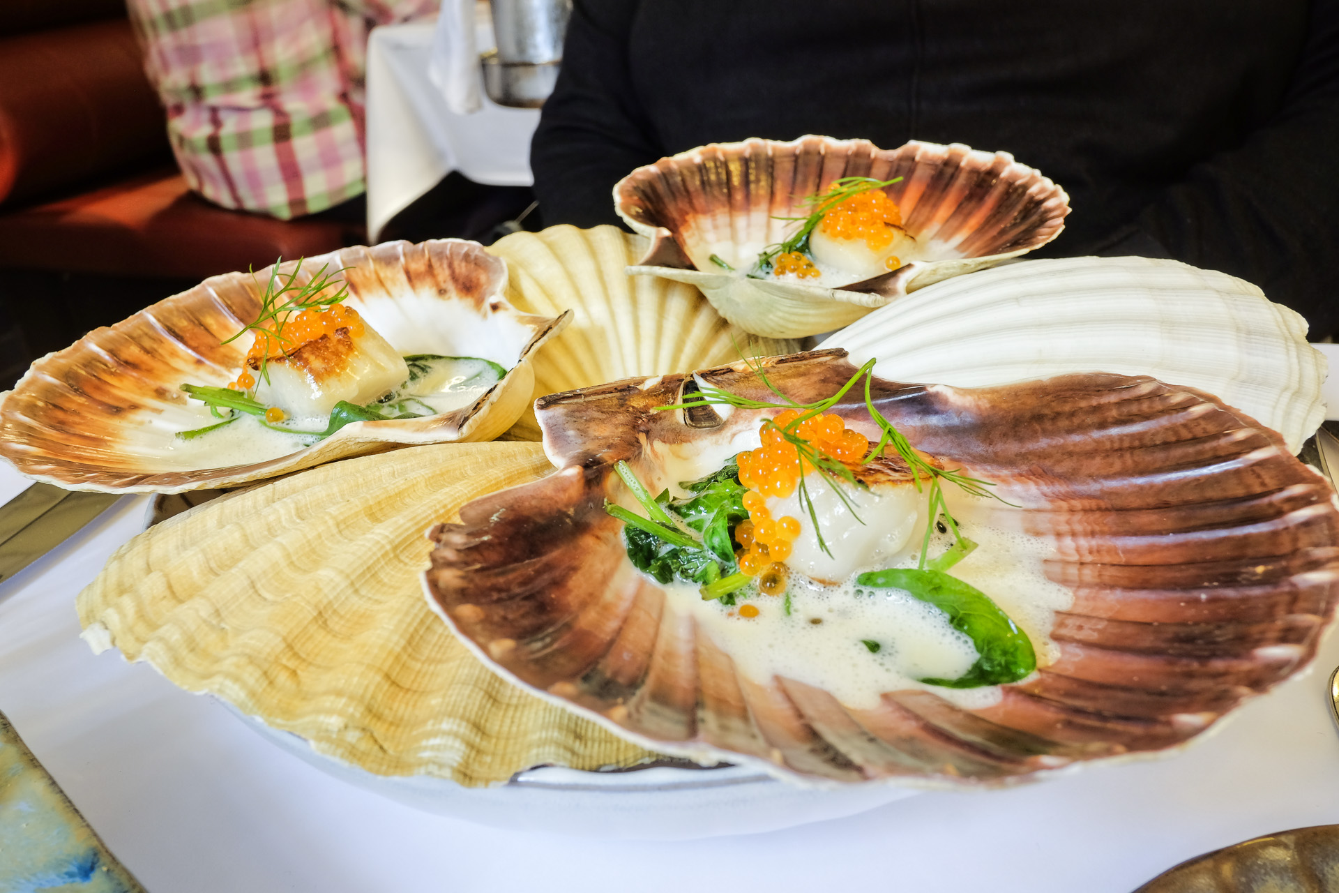 Die gebratenen Jakobsmuscheln waren zart und hatten ein feines, leicht süßlich nussiges Aroma mit leichten Röstnoten. Dazu gab es eine Beurre blanc, Blattspinat und etwas Forellen Kaviar von AKI Kaviar. Sehr lecker.