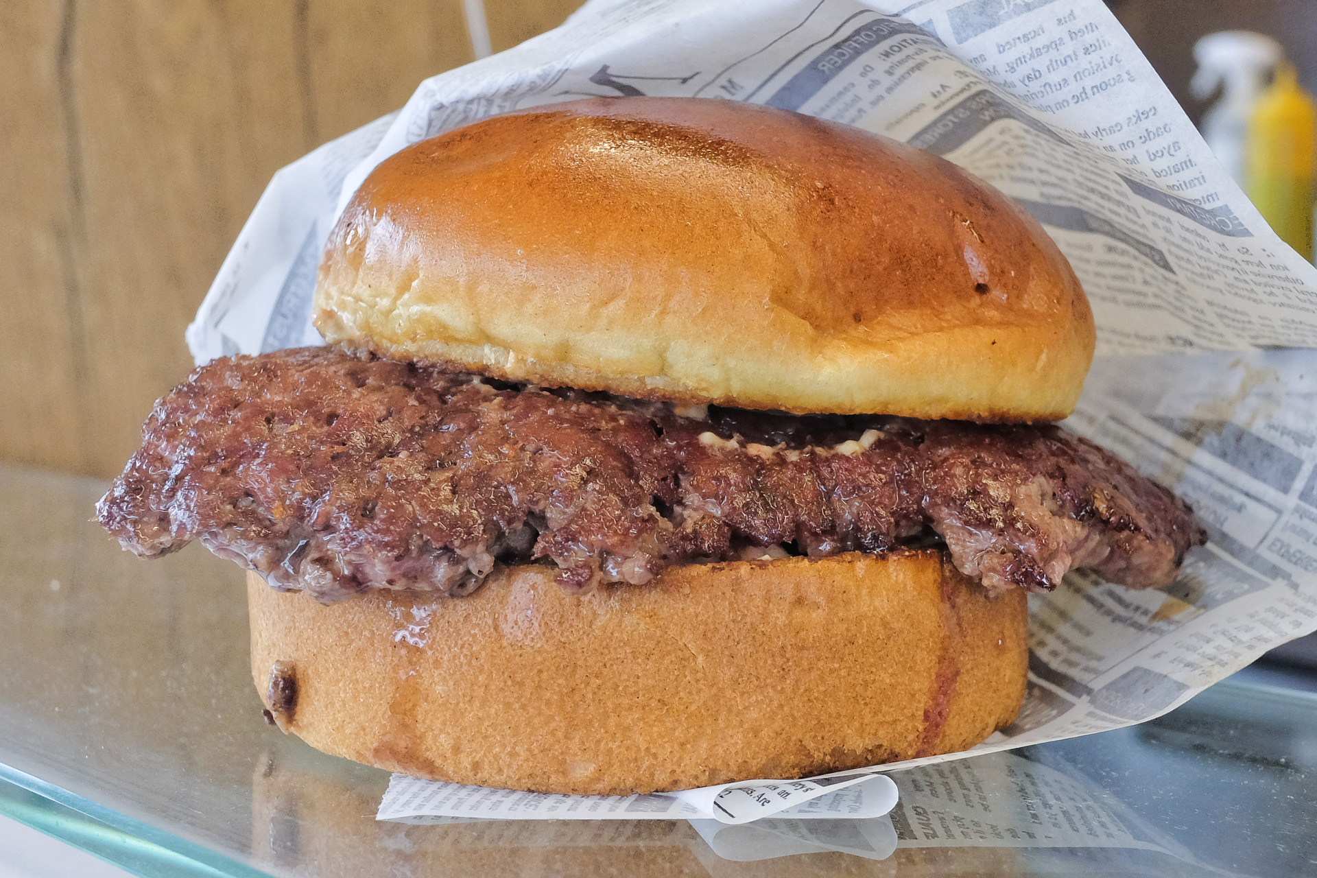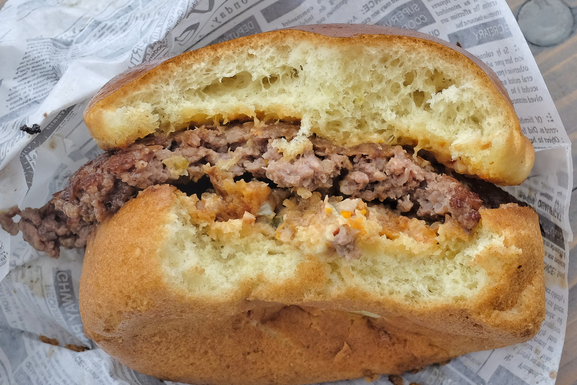 Das Brioche Bun war schön locker und fluffig ohne pappig zu sein, das Patty war saftig, aussen leicht kross und innen leicht rosa (Smashburger). Dazu gab es frittierte Zwiebeln, Gewürzgurken und eine Burger Sauce. Ein schöner Burger, sehr lecker, Klasse.