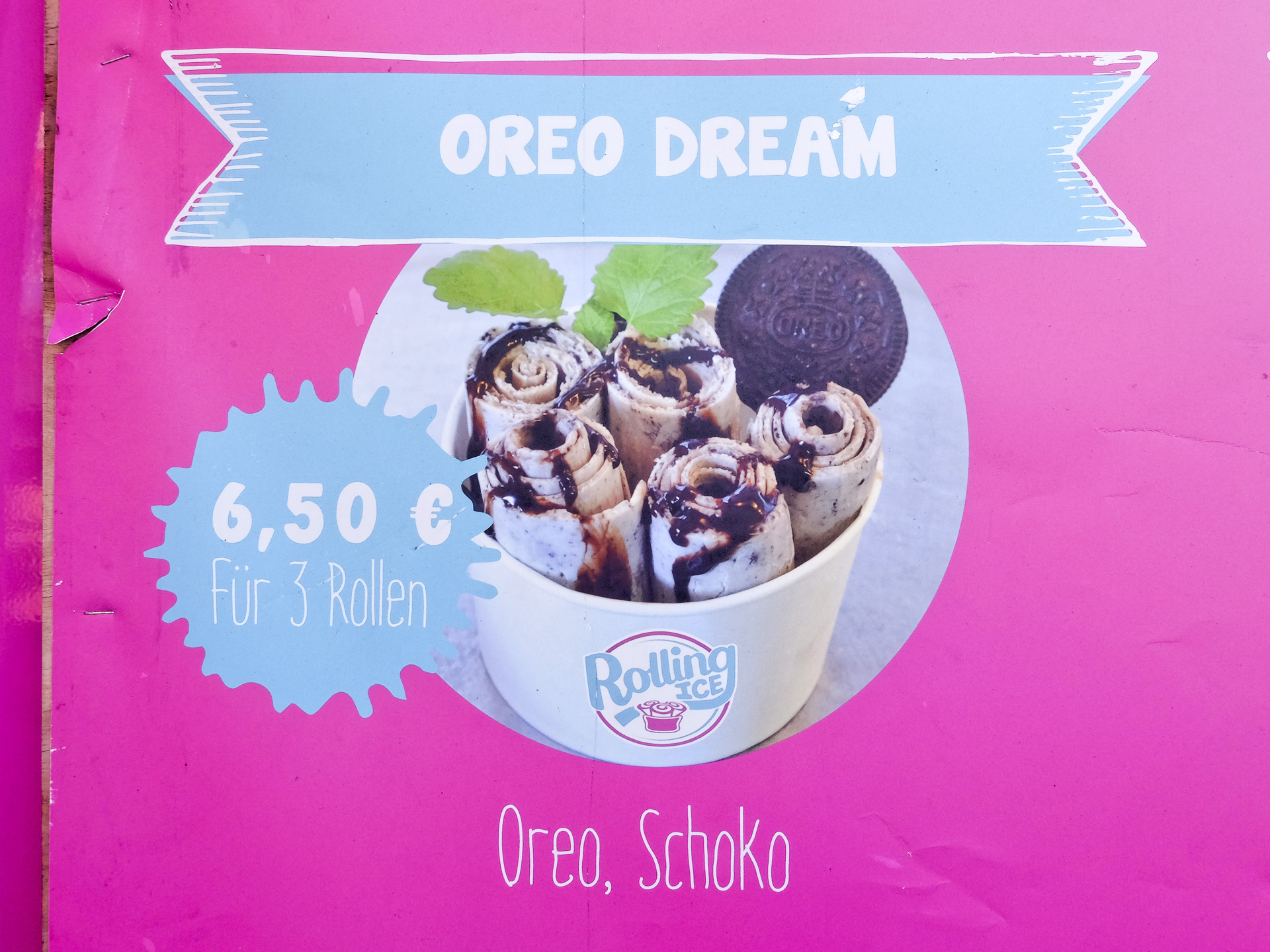 Die Herstellung des "Rolling Ice" ist spektakulär aber sicher auch anstrengend und zeitaufwändig, es kommt aus Asien (Stir-fried ice cream). Diesmal waren schon mehrere Becher vorbereitet und ich konnte die Zubereitung meines Bechers nicht beobachten. Die folgenden Bilder zeigen die Zubereitung, hier am Beispiel des Oreo Dream (Bilder von 2016).