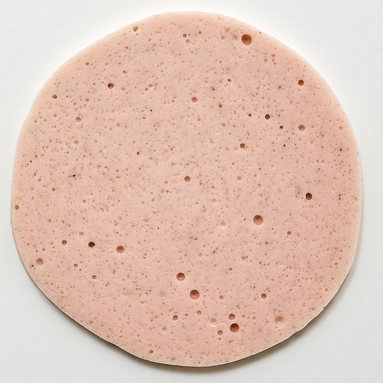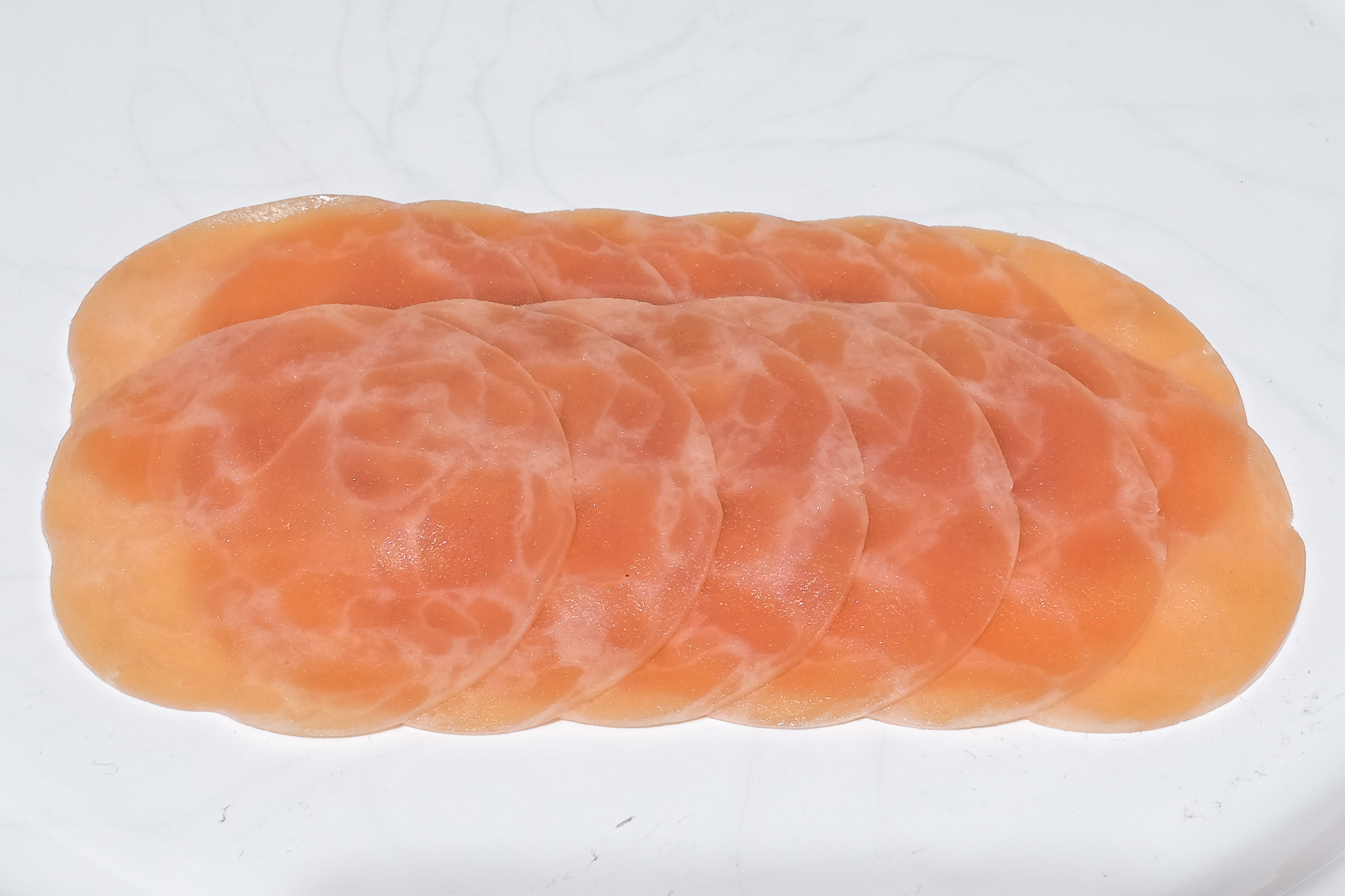 Der Geruch war angenehm und durchaus authentisch, die Textur erinnerte aber mehr an ein Gelee als an Lachsschinken. Der Geschmack war würzig pikant mit kräftiger Pfeffernote. Wegen der untypischen Textur nur ganz lecker.