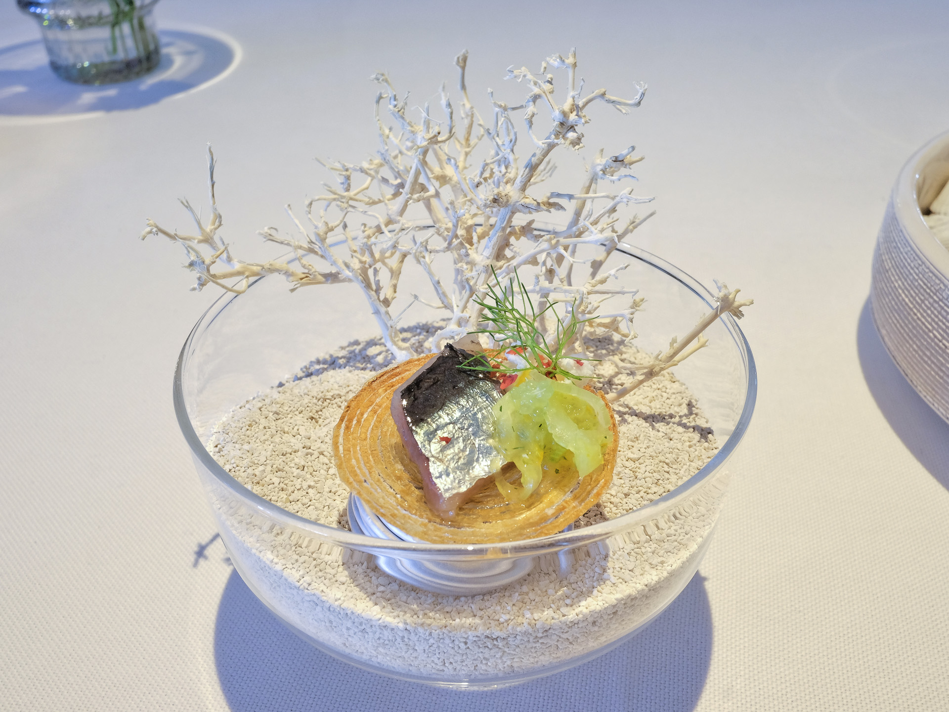 Auf einer knusprigen Kartoffelschnecke ar ein Stück gebeizte Sardine angerichtet, dazu gab es eine Fetacreme und Fenchel. Sehr lecker.