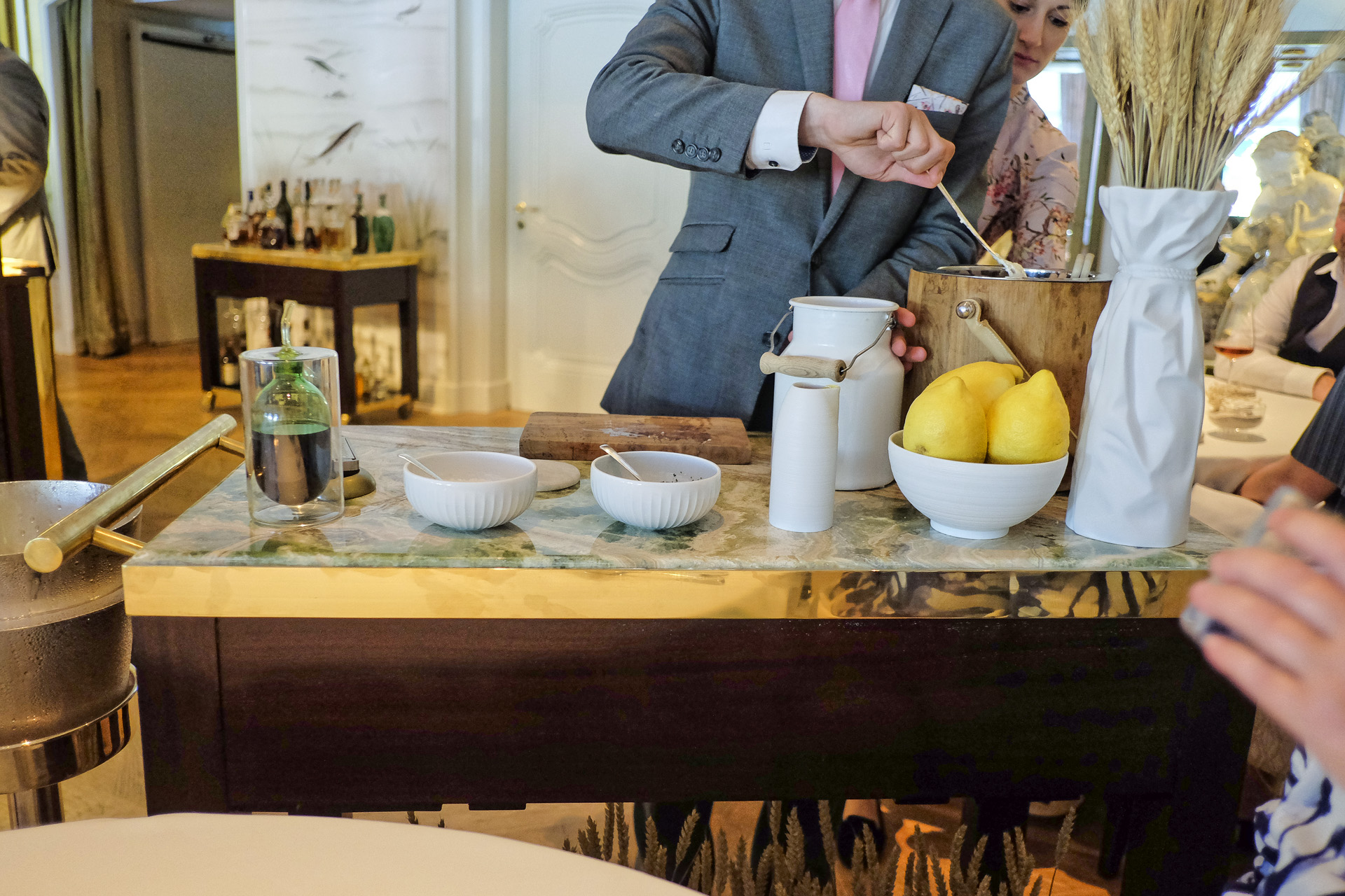 Statt eines Brotwagens gibt es im Haerlin jetzt einen Butterwagen. Die gesalzene Butter stammte vom Affineur Bernard Antony, auf Wunsch wurde sie mit Kräutern, Kräuter Öl oder Zitrone verfeinert.