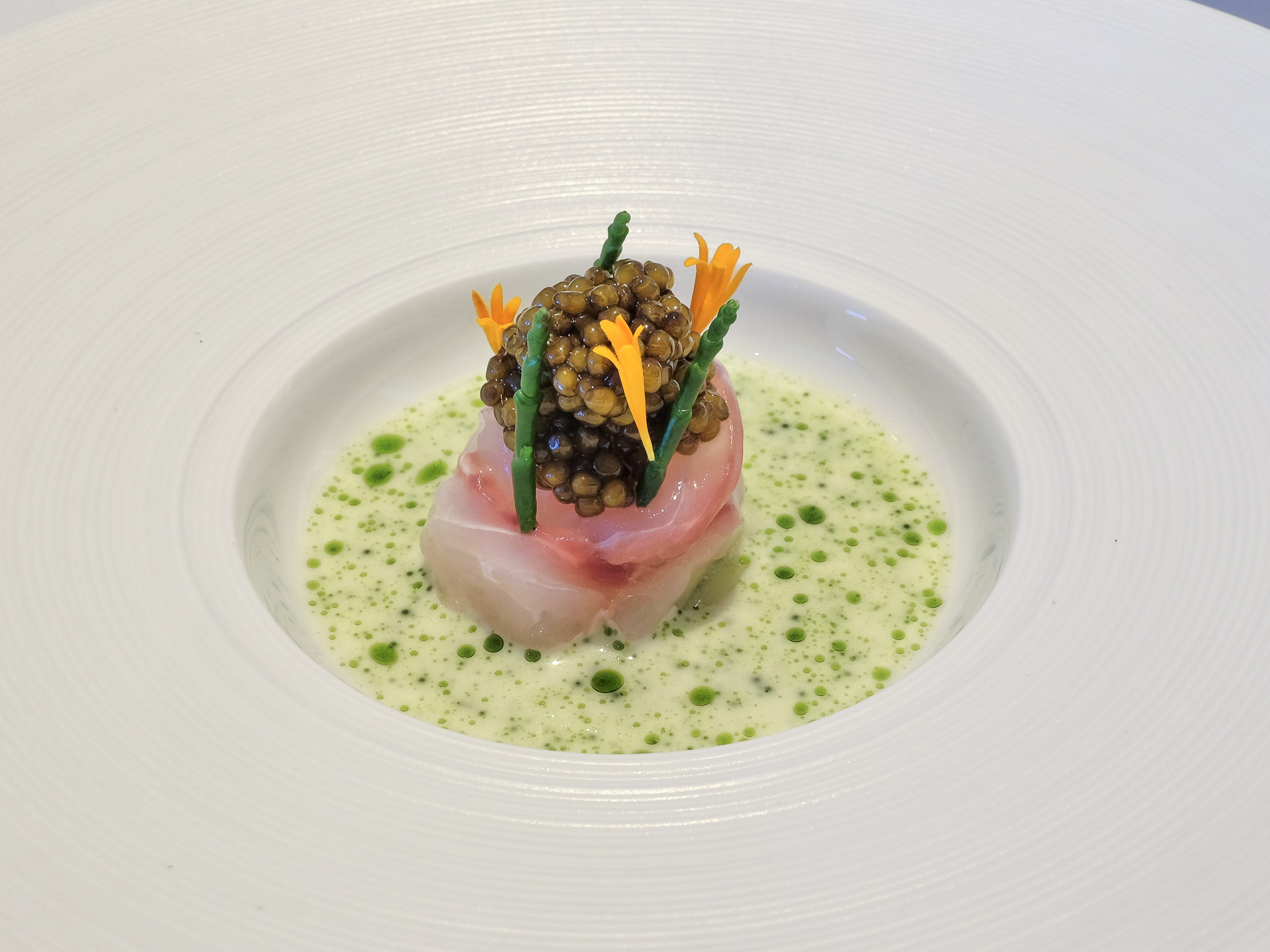Der gebeizte Wolfsbarsch war zu einer Rose geformt, er war zart und hatte ein feines Aroma. Dazu gab es Imperial Kaviar, eine Stabmuschel Vinaigrette mit Gurke und etwas Salicorn. Sehr lecker.
