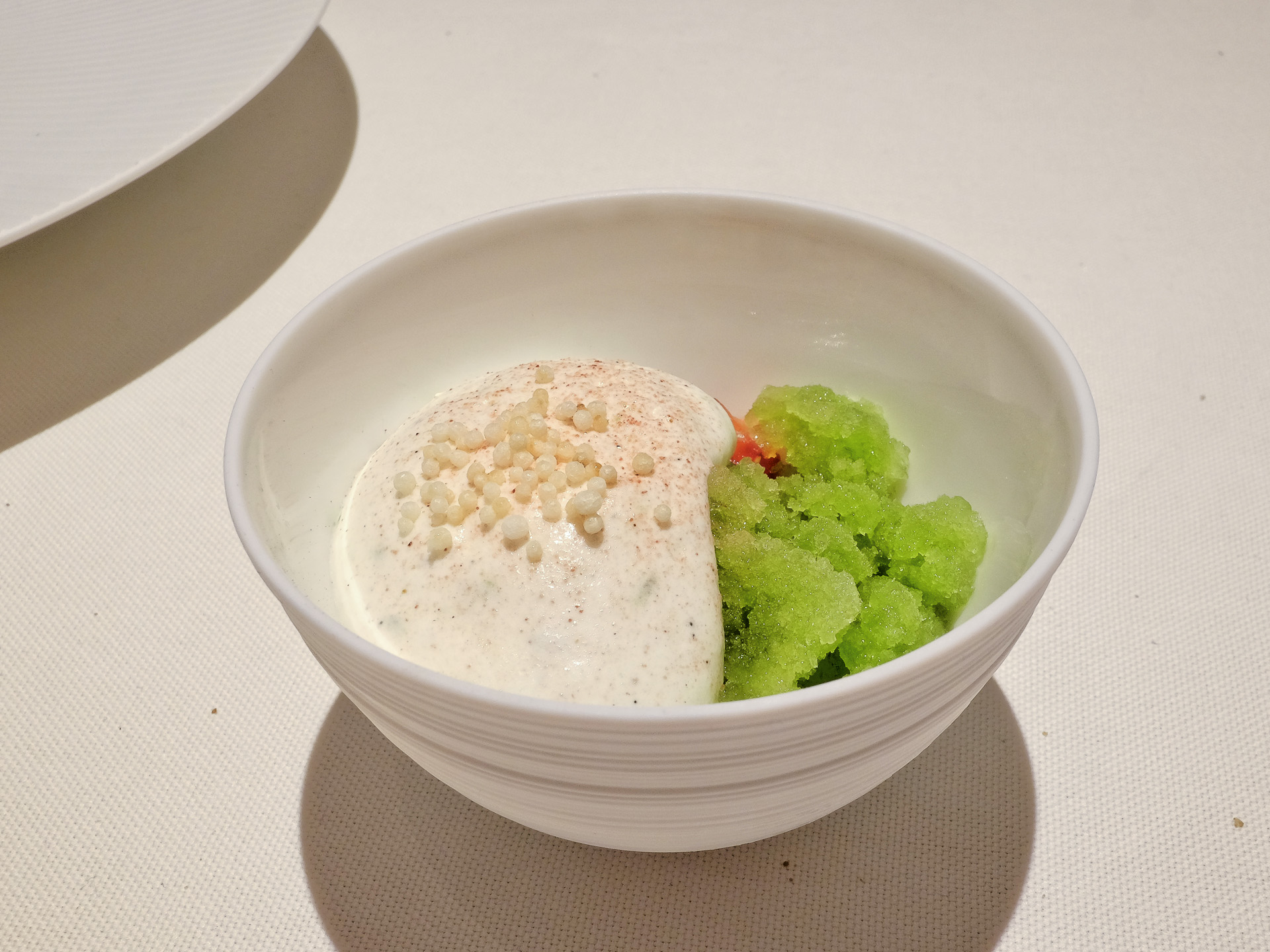 mit Holunderblütensorbet & Hafercreme, Clery Erdbeere mit Weizengras-Granité & Quarkschaum