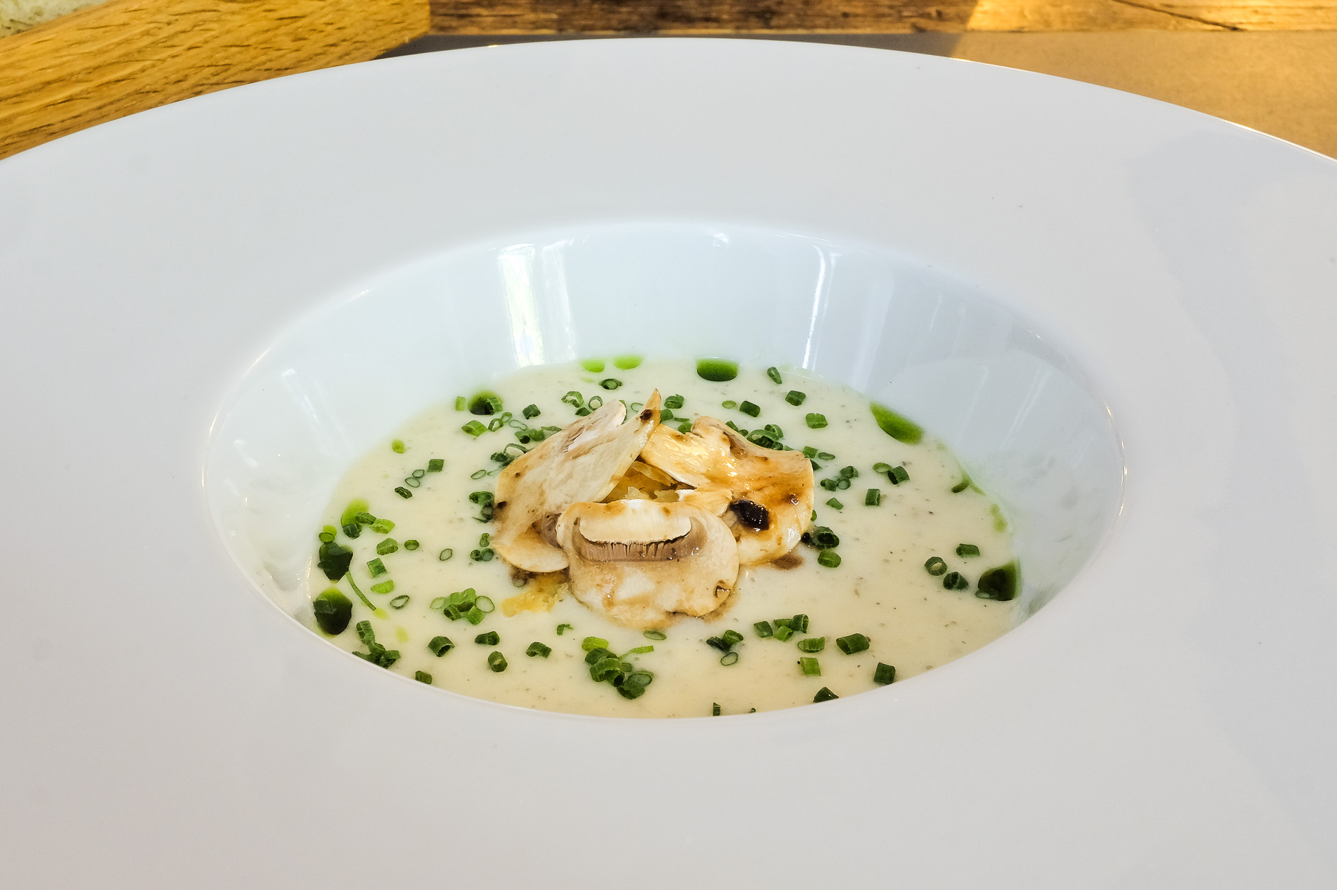 Das Onsenei hatte ein für meinen Geschmack zu rohes Eiweiß und ein fast flüssiges Eigelb. Dazu gab es Trüffel Pasta, etwas Parmesan, ein Trüffel Bechamel Espuma, gehobelte Champignons, etwas Schnittlauch und Schnittlauch Öl. Sehr lecker.