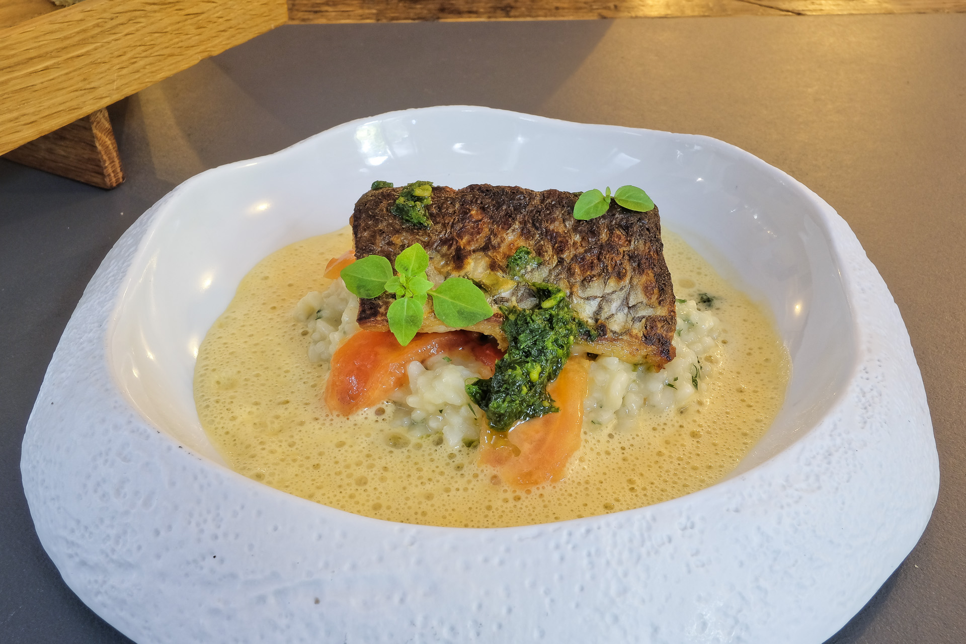 Der Adlerfisch wurde über Holzkohle gegrillt, er war zart, hatte eine leicht krosse Haut und durch das Grillen feine Röstaromen. Dazu gab es ein schlotziges aromatisches Risotto, etwas Bärlauch Pesto, Tomaten, perfekt al dente grüne Bohnen und einen Bouillabaisse Schaum. Sehr lecker.