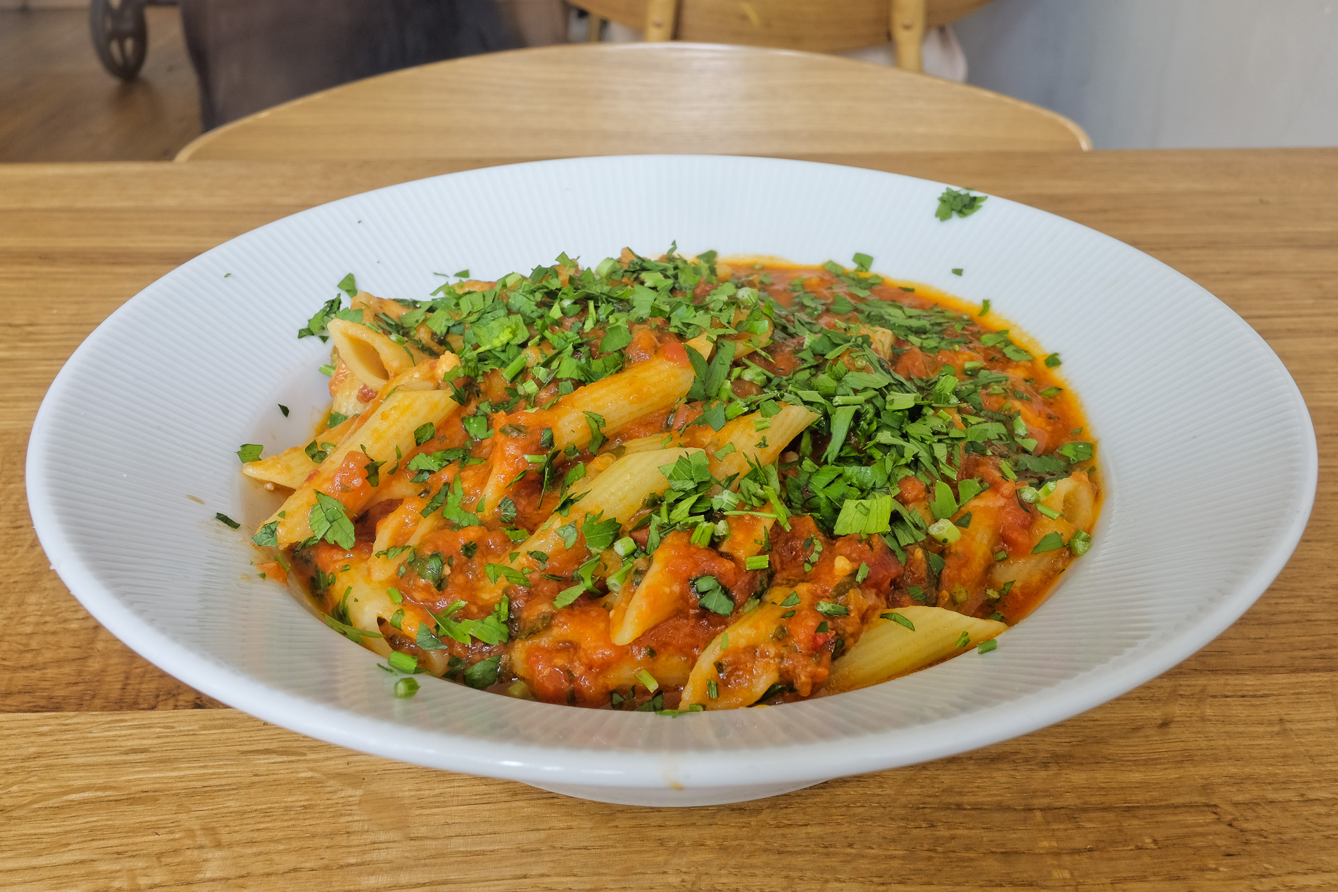 Die Nudeln waren perfekt al dente, dazu gab es eine Tomatensauce mit Chili, Knoblauch, Petersilie und Parmesan. Aromatisch und ordentlich pikant wie es sich für eine Penne all’Arrabbiata gehört, sehr lecker.