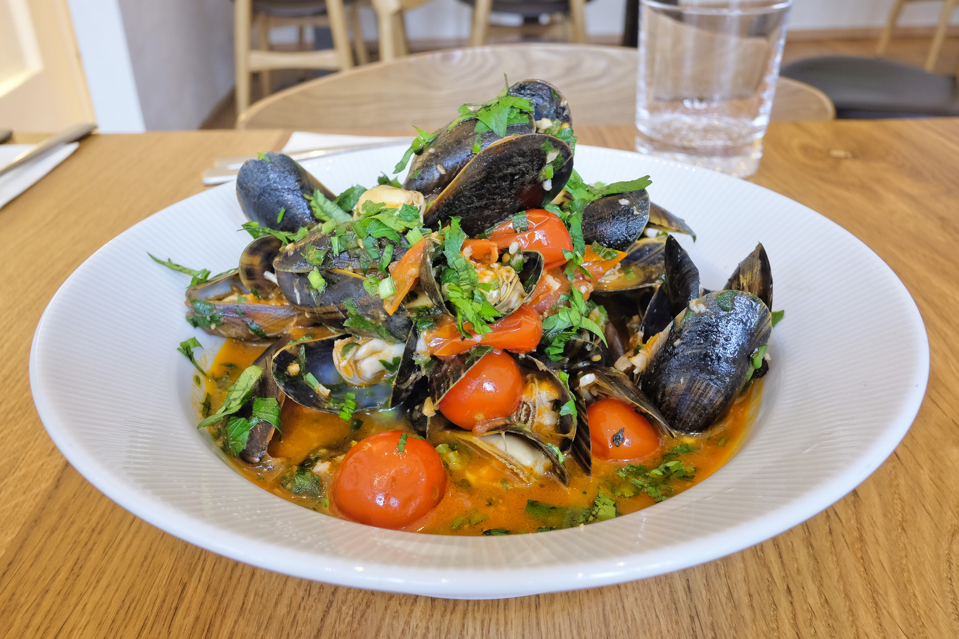 Die Miesmuscheln waren zart und hatten ein feines Aroma. Die Suppe enthielt viel Tomaten und war mit reichlich Knoblauch und Petersilie gewürzt. Sehr lecker, durch die Tomaten war die Suppe aber betont säuerlich.