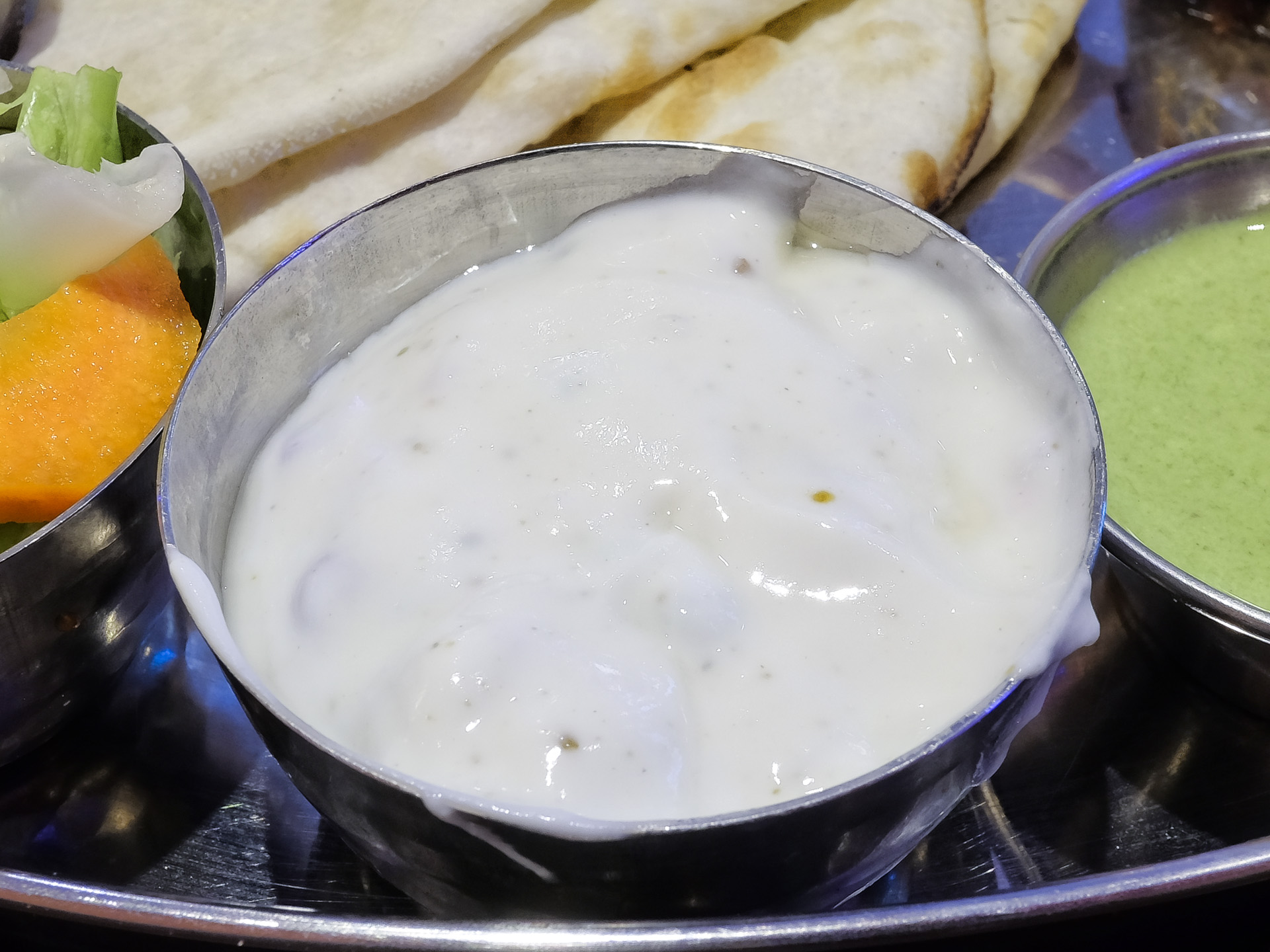 Raita ist ein Gericht auf der Basis von Joghurt, es enthielt Gurken und Zwiebeln. Sehr lecker.