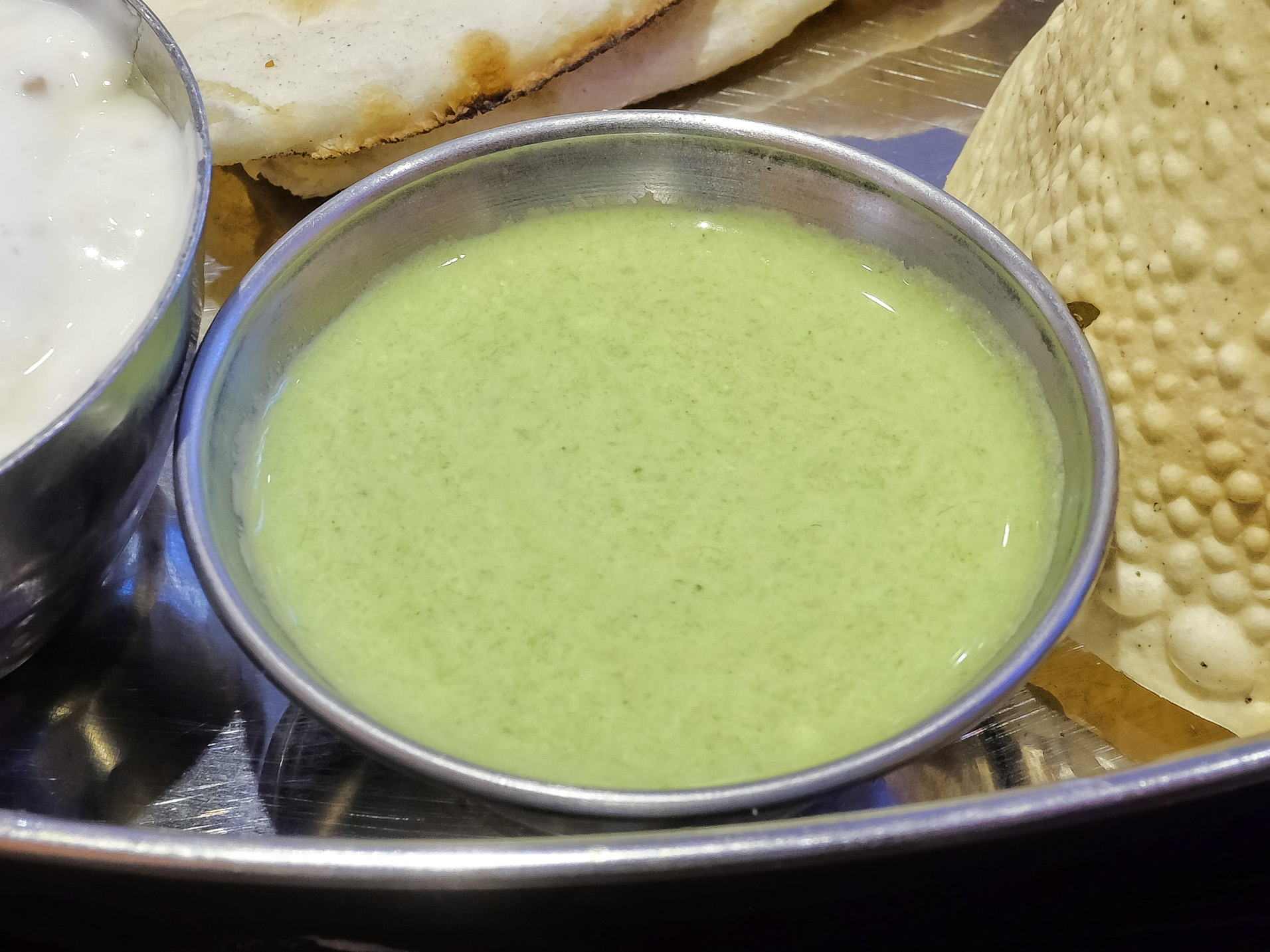 Das Koriander Chutney war leicht säuerlich und hatte eine pikante Schärfe. Sehr lecker.