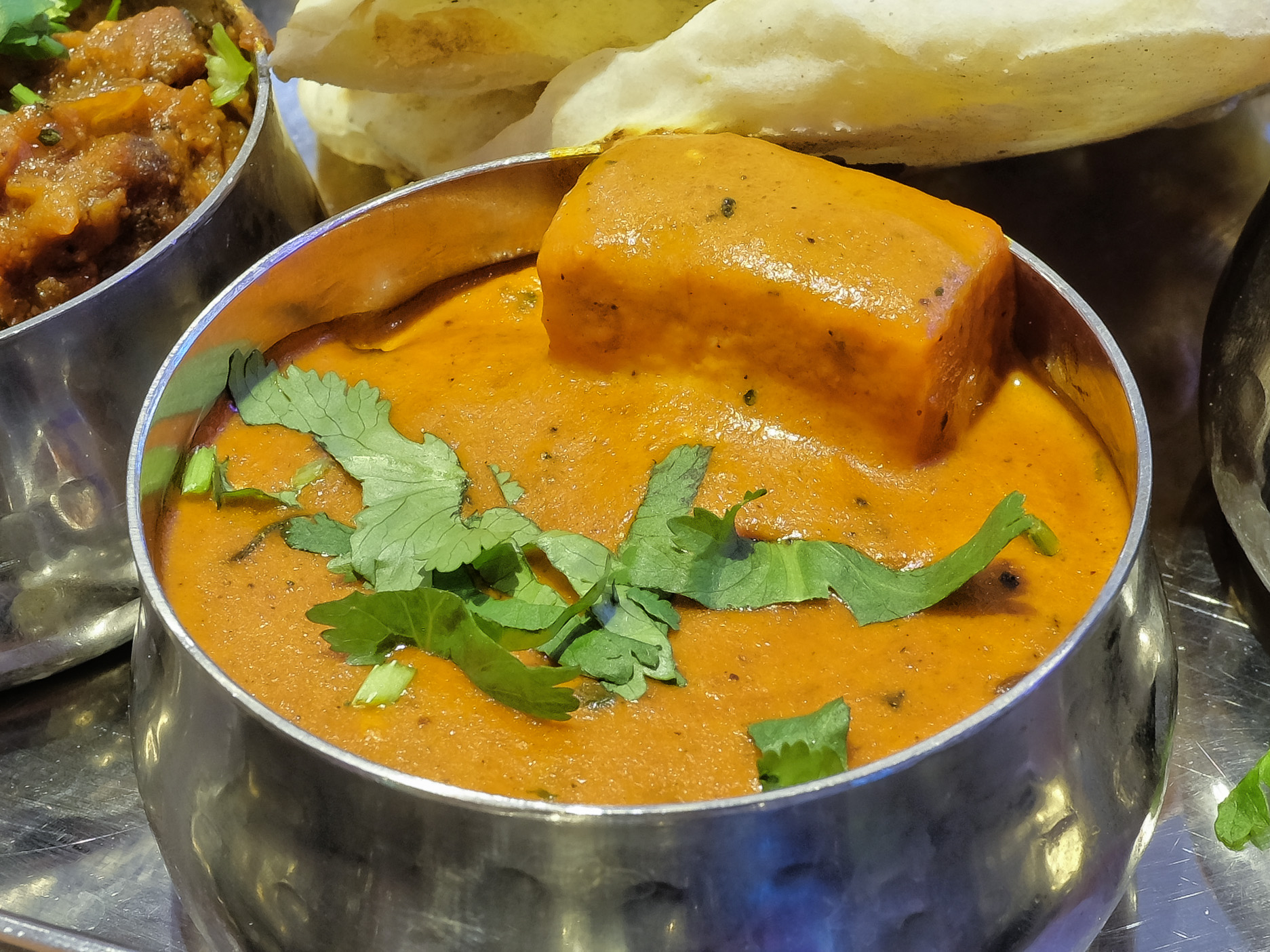 Der Paneer war zart, dazu gab es eine Cashewnuss Sauce und eine Tomaten Currysauce. Sehr lecker.