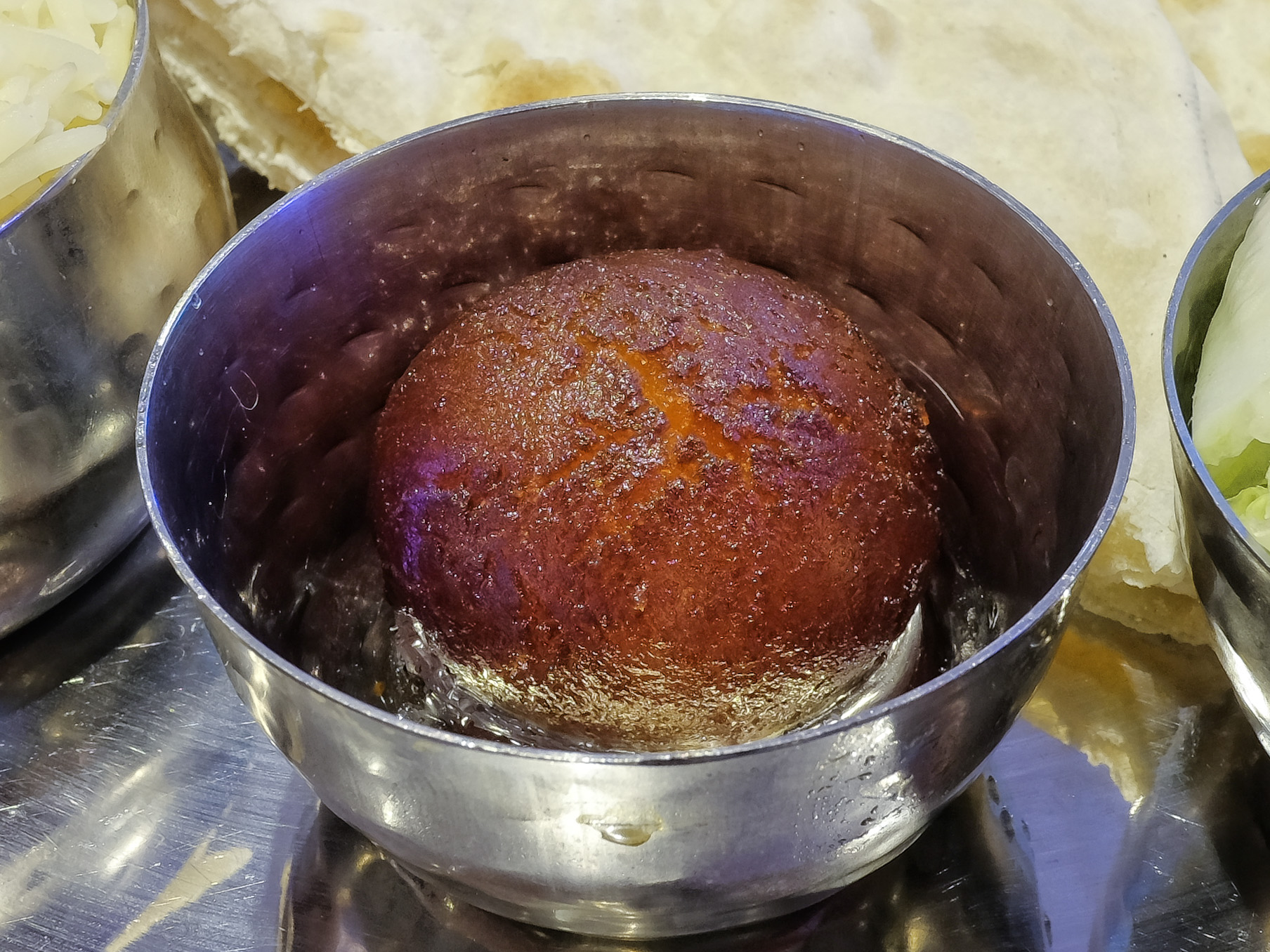 Als Dessert gab es Gulab Jamun, ein frittiertes Teigbällchen in Zuckersirup. Sehr lecker.