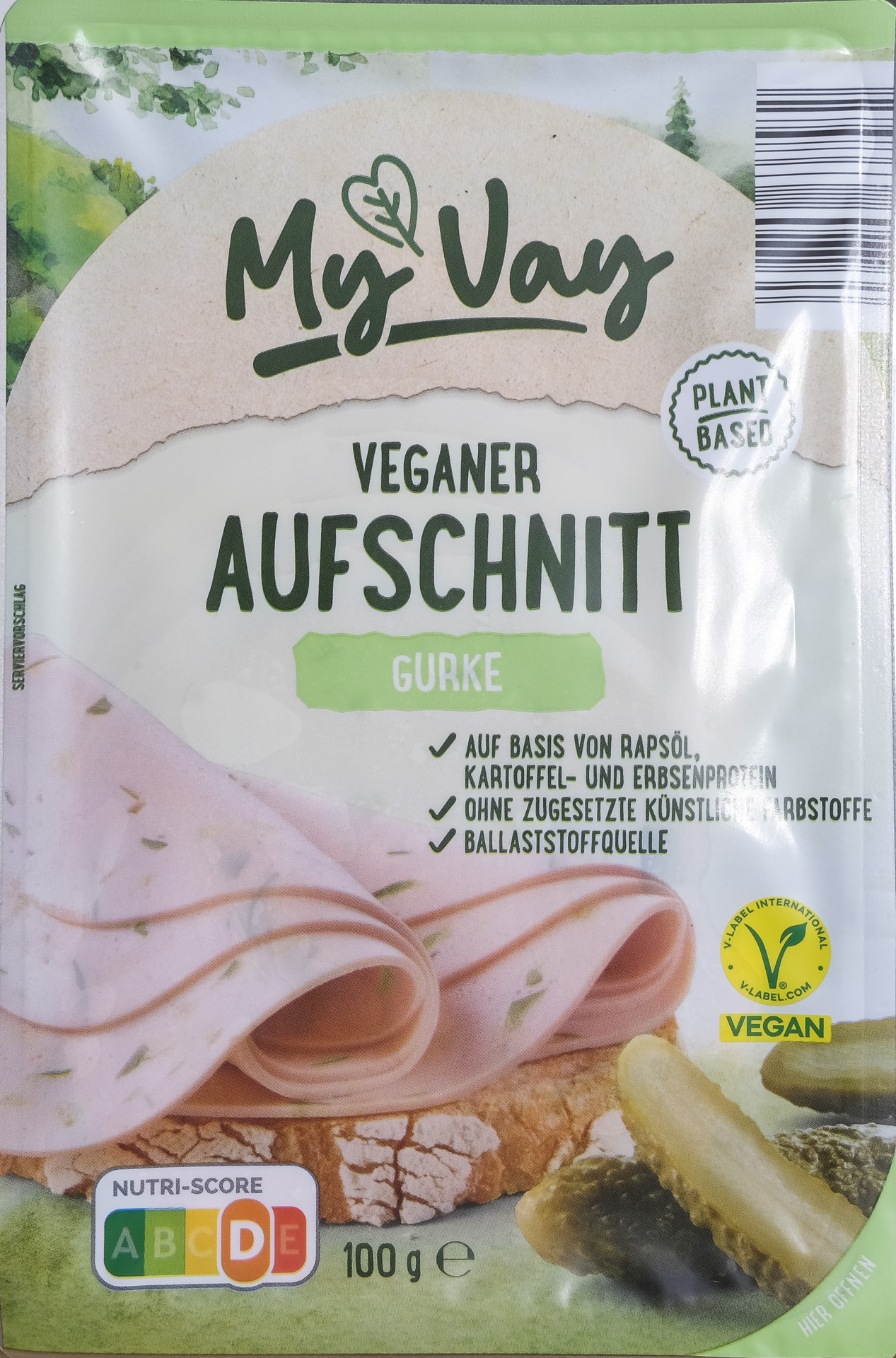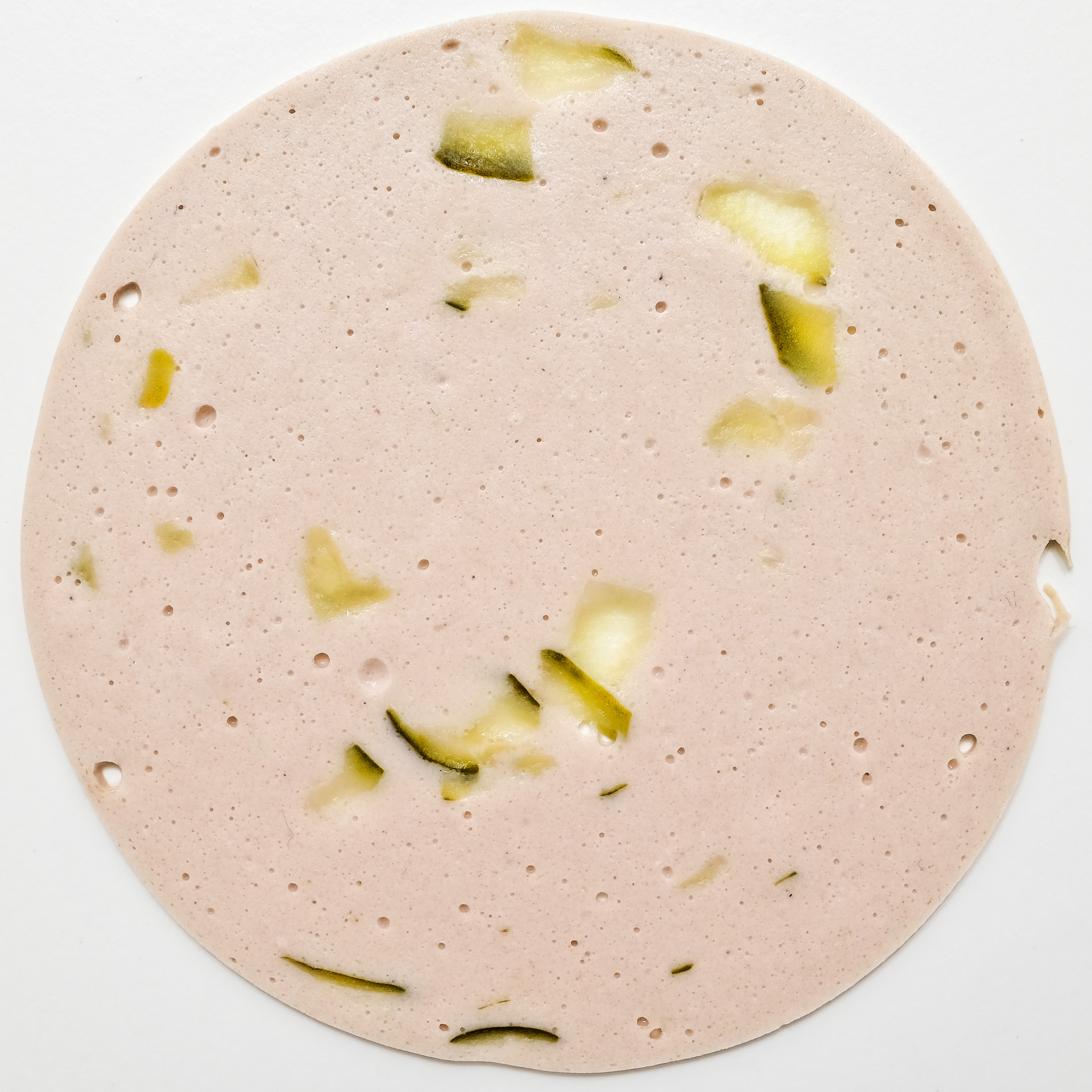 Veganes Erzeugnis nach Art einer Mortadella mit Gurke, auf Basis von Rapsöl, Kartoffel- und Erbsenprotein (Zitat My Vay)