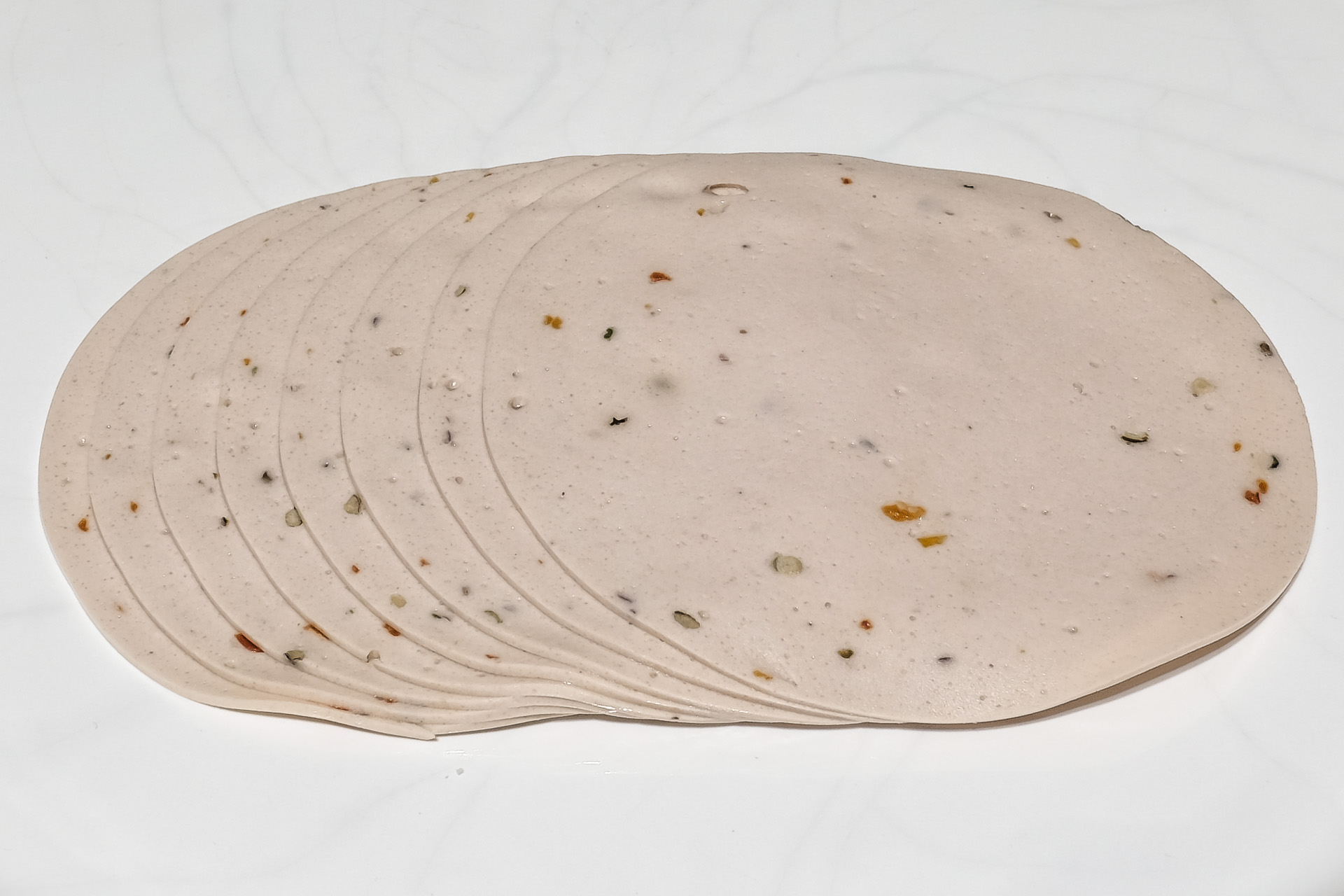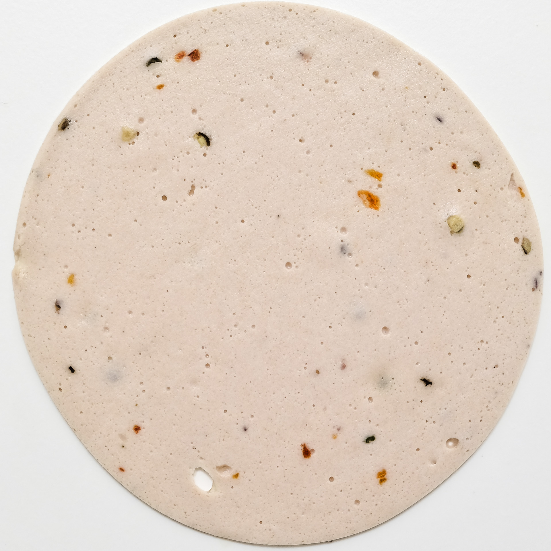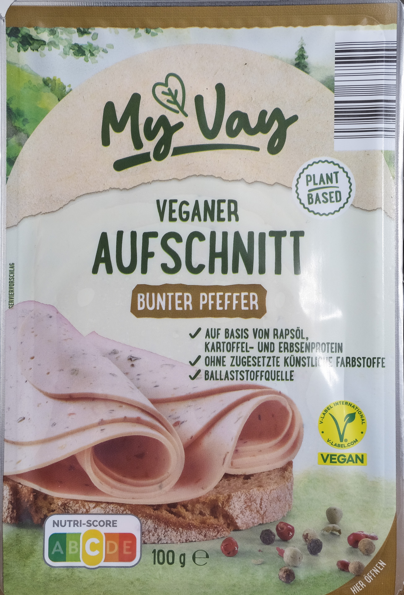 Veganes Erzeugnis nach Art einer Mortadella mit buntem Pfeffer, auf Basis von Rapsöl, Kartoffel- und Erbsenprotein (Zitat My Vay)