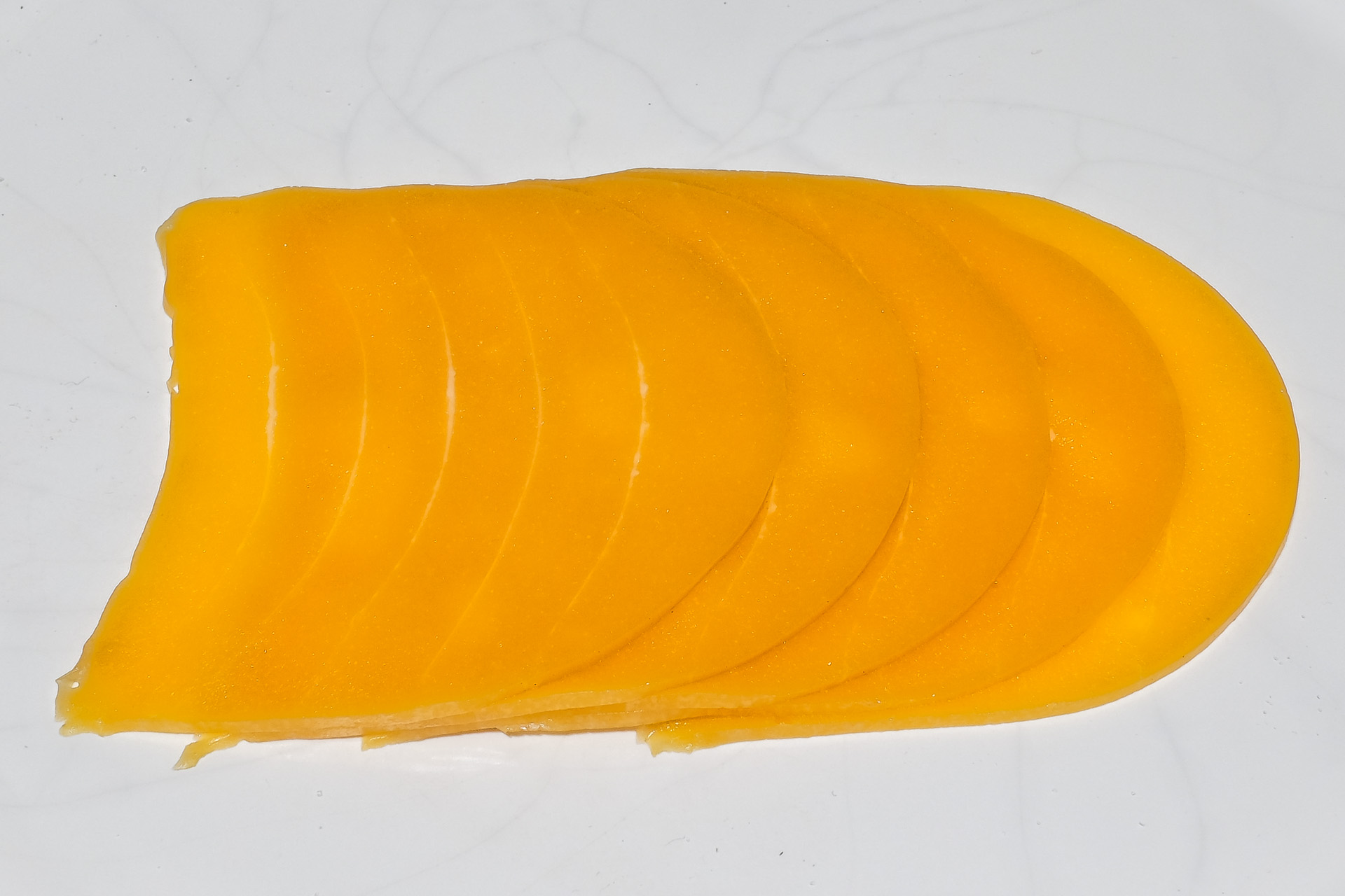 Der Geruch war angenehm und leicht würzig säuerlich, die Scheiben waren dünn geschnitten und mit angenehmen Biss und hatten ein leicht würzig säuerliches Aroma. Sehr lecker.